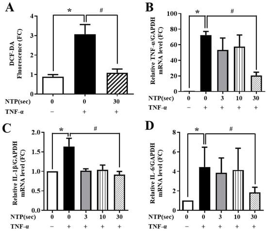 Effect of NTP on TNF-α-induced ROS generation and inflammatory cytokine expression in HUVECs. HUVECs were treated with NTP for 0, 3, 10, or 30 s, followed by TNF-α stimulation (10 ng/mL for 60 min) and 12 h incubation. (A) Intracellular ROS levels were measured using DCF-DA fluorescence assay. (B–D) mRNA levels of pro-inflammatory cytokines TNF-α (B), IL-1β (C), and IL-6 (D) were quantified by qPCR. A TNF-α-only control group (without NTP) was included. Notably, IL-1β showed significant inhibition even at 3 s, while TNF-α and IL-6 required 30 s of NTP exposure. Data are shown as individual values with the mean ± SD from three independent experiments. Statistical analysis shows that * p < 0.05 compared with the no-NTP treatment group, and # p < 0.05 compared with the TNF-α-only treatment group.