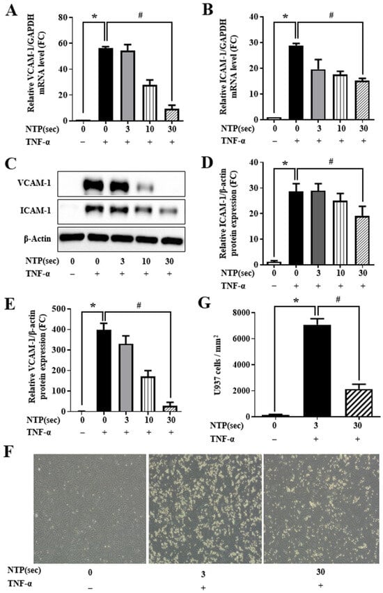 Effect of NTP on TNF-α-induced adhesion molecule expression and monocyte adhesion in HUVECs. HUVECs were treated with NTP (0, 3, 10, or 30 s), stimulated with TNF-α (10 ng/mL for 60 min), and incubated for 12 h. (A,B) qPCR analysis of mRNA levels of VCAM-1 and ICAM-1. (C) Western blot analysis of VCAM-1 and ICAM-1 protein expression. (D,E) Densitometric quantification using ImageJ (Quantity One 1-D software). (F) Representative photomicrographs showing U937 monocyte adhesion to HUVECs. (G) Quantification of adherent monocytes. Data are expressed as individual values with the mean ± SD from three independent experiments. Statistical analysis shows that * p < 0.05 compared with the no-NTP treatment group, and # p < 0.05 compared with the TNF-α-only treatment group.