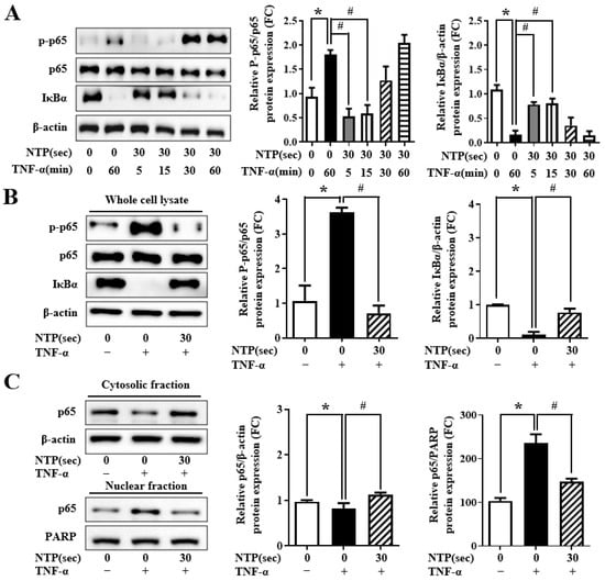 Effect of NTP on TNF-α-induced NF-κB signaling in HUVECs. HUVECs were treated with NTP for 0 or 30 s and incubated for 30 min before stimulation with TNF-α (10 ng/mL). Time course experiments were performed with TNF-α stimulation for 5, 15, 30, and 60 min, followed by protein analysis at each time point. (A,B) Western blot of phosphorylated p65 (p-p65), total p65, and IκBα in whole-cell lysates. (C) Western blot of p65 from cytosolic and nuclear fractions to assess nuclear translocation. (D) Immunofluorescence images showing localization of p65 (green) and DAPI (blue) under each treatment. Quantification of nuclear p65-positive cells is shown. Images represent three independent experiments. Statistical analysis shows that * p < 0.05 compared with the no-NTP treatment group, and # p < 0.05 compared with the TNF-α-only treatment group.