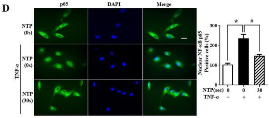 Cells were exposed directly to NTP for different time points (0 s, 3 s, 10 s and 30 s) at 5 different spots in each well and incubated for 30 min followed by stimulation with 10 ng/mL tumor necrosis factor-α (TNF-α) (Sigma Aldrich, St. Louis, MO, USA) and incubation for another 12 h at 37 °C. After 12 h incubation, subsequent experiments were performed.