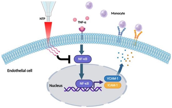 In addition to cytokine suppression, NTP treatment was shown to decrease the expression of adhesion molecules such as VCAM-1 and ICAM-1 (Figure 4). These adhesion molecules facilitate the adhesion and recruitment of leukocytes to the endothelium, a key step in the initiation and progression of vascular inflammation. NTP reduced monocyte adhesion to endothelial cells, as confirmed by monocyte adhesion assays in this study (Figure 4). The NTP effect on adhesion molecules not only alleviates vascular inflammation but also addresses one of the earliest events in the inflammatory cascade, potentially preventing the progression of endothelial dysfunction and associated diseases. In this study, the anti-inflammatory effects of NTP are consistent with previous studies that reported similar findings across various cell types and tissues. For instance, NTP has been shown to reduce inflammation in lung epithelial cells and skin tissues, indicating anti-inflammatory properties of NTP [,,,]. Importantly, our study also confirmed that NTP treatment does not compromise endothelial cell viability or proliferation, a critical consideration for clinical applications. The ability of NTP to exert anti-inflammatory effects while maintaining cell viability and proliferation makes it a particularly promising candidate for further preclinical and clinical development.