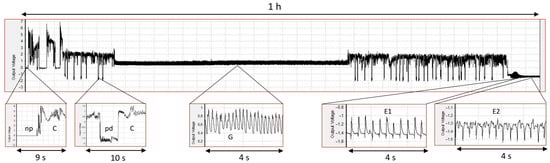 Electrical Penetration Graph recording of Myzus persicae stylet activities in plant tissues of Brassica rapa ssp. Pekinensis treated with 0.1% apigenin. Upper panel illustrates a 1 h section of the 8 h EPG. Lower panels show the details of individual EPG waveforms corresponding to the display in the upper panel. “np”—no probing; “C”—progressive stylet movements within the apoplast and occasional punctures of cells adjacent to the stylet track represented as potential drops, “pds”; “G”—active uptake of xylem sap; “E1”—egestion of saliva into sieve elements; “E2”—passive ingestion of phloem sap from sieve elements.