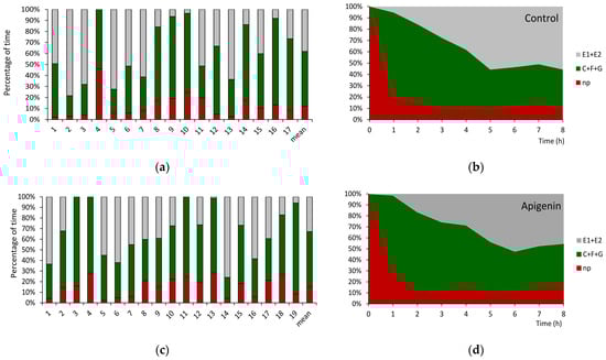 The no-probing activities, i.e., when aphids kept their stylets withdrawn from plant tissues, occupied a similar proportion of the complete experimental time, i.e., 12.5%, 13.1%, and 11.3%, on untreated and apigenin- and luteolin-treated plants, respectively, despite individual variation in behavior between aphids within each treatment (Table 1 and Table S1; Figure 3a,c,e). Correspondingly, the proportions of probing activities spent on pathway (“C”) and phloem activities (“E”) were comparable between the treatments and amounted to, respectively, from 46% of the total probing time on luteolin-treated plants to 53 % on apigenin-treated plants (pathway) and from 42% on apigenin-treated plants to 48 % (phloem sap ingestion) on luteolin-treated plants. Likewise, the frequency and duration of derailed stylet activities in the apoplast (“F”) were similar in all treatments (Table 1 and Table S1). Significant differences occurred in the average duration of xylem sap ingestion, “G”: the longest ingestion periods and the highest proportion of probing time spent on “G” activity occurred in aphids on apigenin-treated plants. The duration of individual bouts of watery salivation, “E1”, preceding the first bout of sustained phloem sap ingestion (“E2 > 10 min”) differed significantly between treatments: the longest “E1” occurred in aphids on apigenin-treated plants (Table 1 and Table S1).