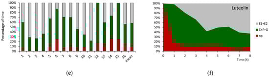Individual variation and sequential changes in probing behavior of Myzus persicae on Brassica rapa ssp. pekinensis untreated (a,b) and treated with 0.1% apigenin (c,d) and 0.1% luteolin (e,f). Panels (a,c,e) represent the proportion of time (percentage of cumulative time for individual aphids and the mean of the group) devoted to individual probing activities. Panels (b,d,f) represent the proportion of time (average percentage of cumulative time for aphids in the group) devoted to individual activities during the successive hours of the 8 h EPG recording. np = no probing; C + F + G = pathway + derailed stylet activities + xylem phase; E = phloem phase E1 (salivation) + E2 (sap ingestion) activities.