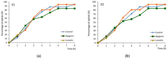 Cumulative percentage of Myzus persicae that attained the phloem phase (reached sieve elements) during 8 h EPG monitoring of control untreated Brassica rapa ssp. pekinensis and Brassica rapa ssp. pekinensis treated trans-epidermally with 0.1% apigenin and 0.1% luteolin. Panel (a) represents aphids that showed any contact with sieve elements confirmed by the appearance of the first “E1” waveform (phloem salivation) in the successive hours of the EPG recording. Panel (b) represents aphids that showed the first bout of ingestion activity confirmed by the appearance of the first “E2” waveform (phloem sap ingestion) in the successive hours of the EPG recording.