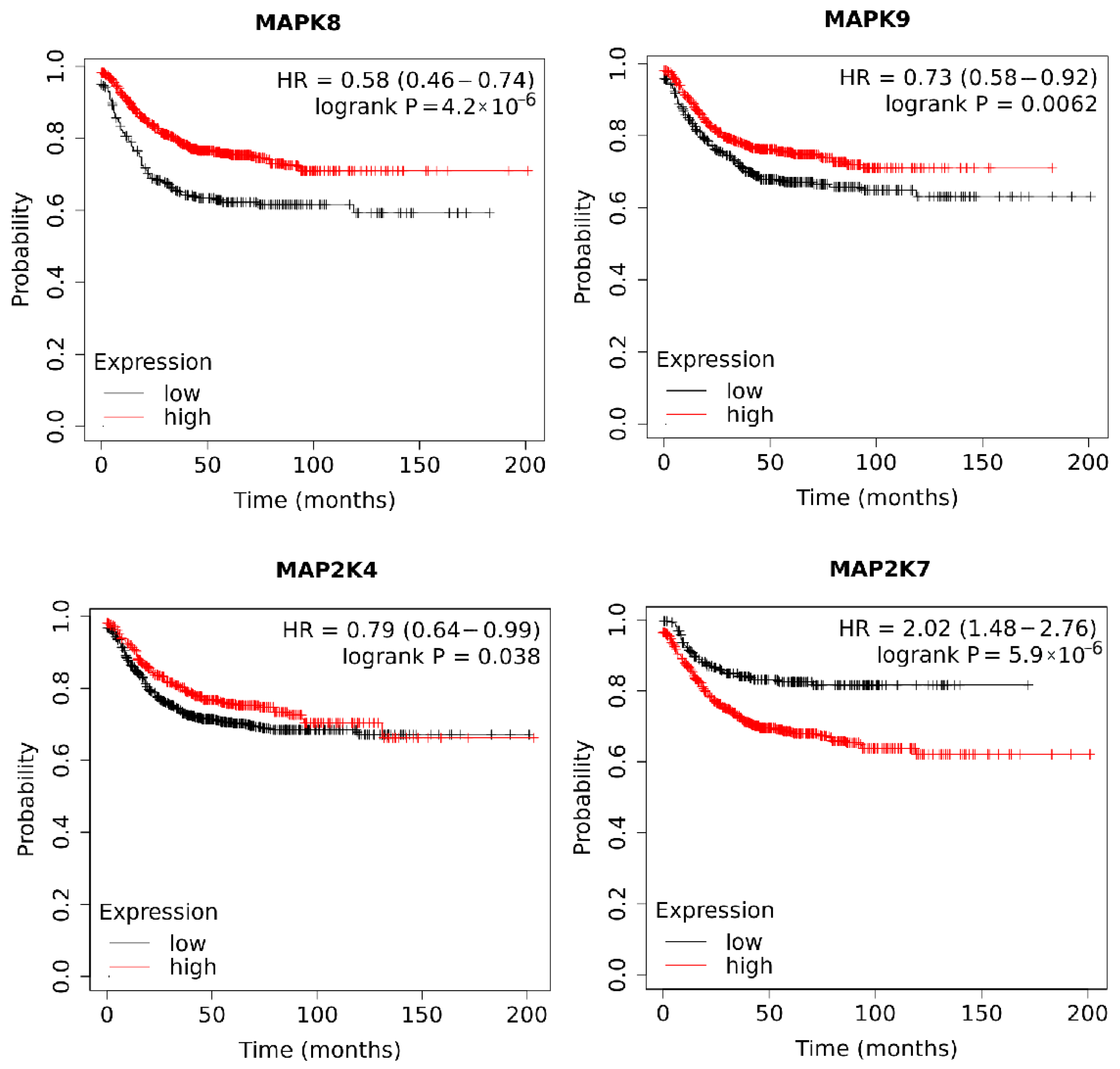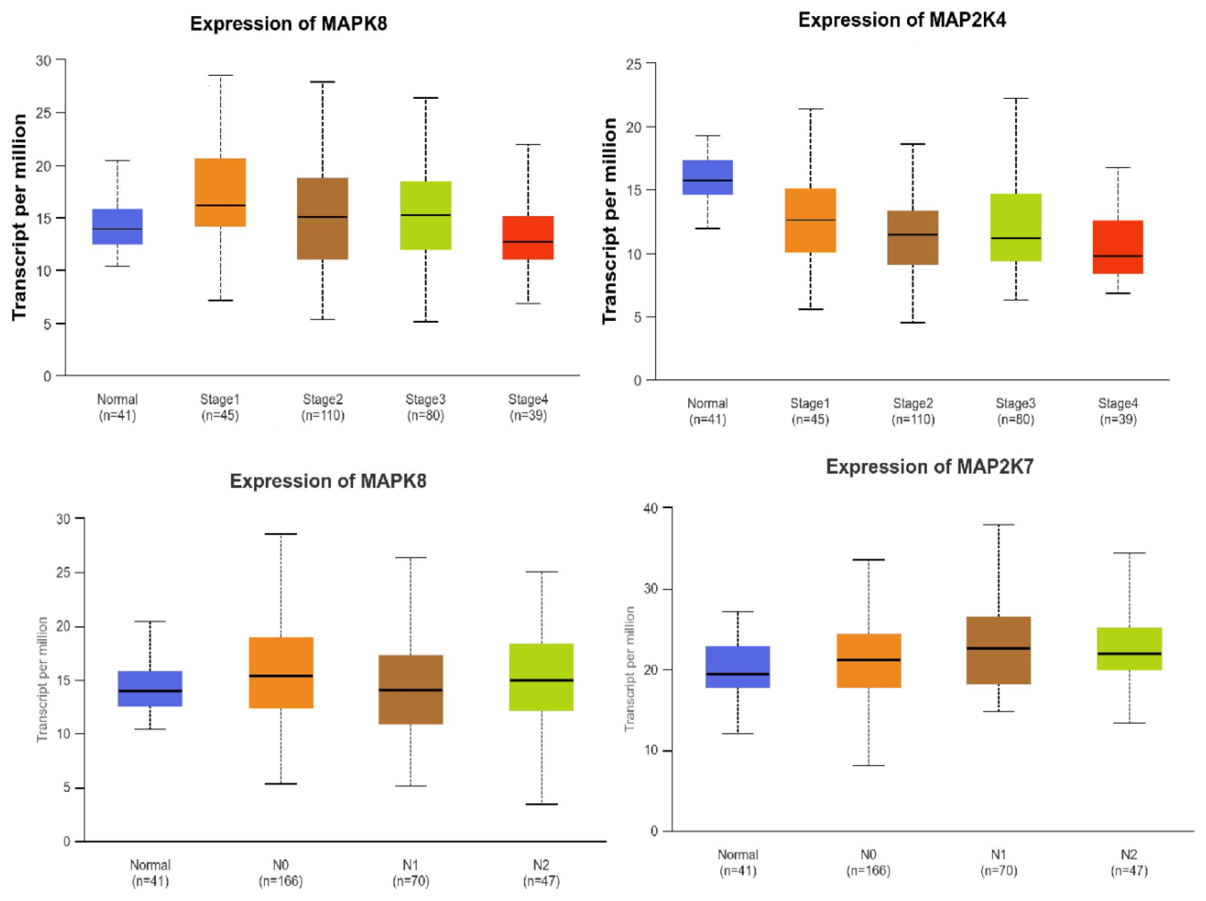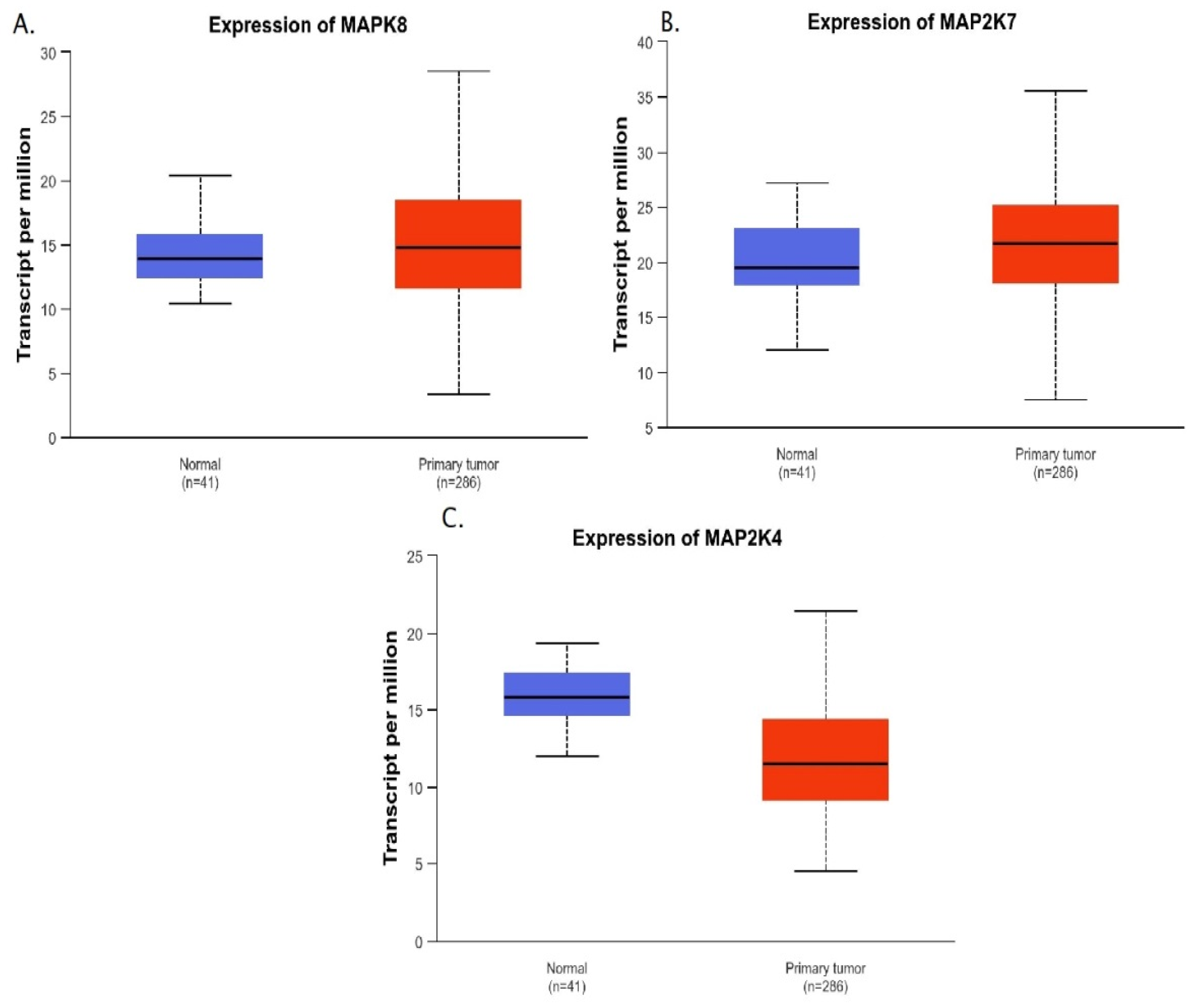 | Gene Expression Level: | MAP2K4 | MAP2K7 | MAPK8 | MAPK9 |