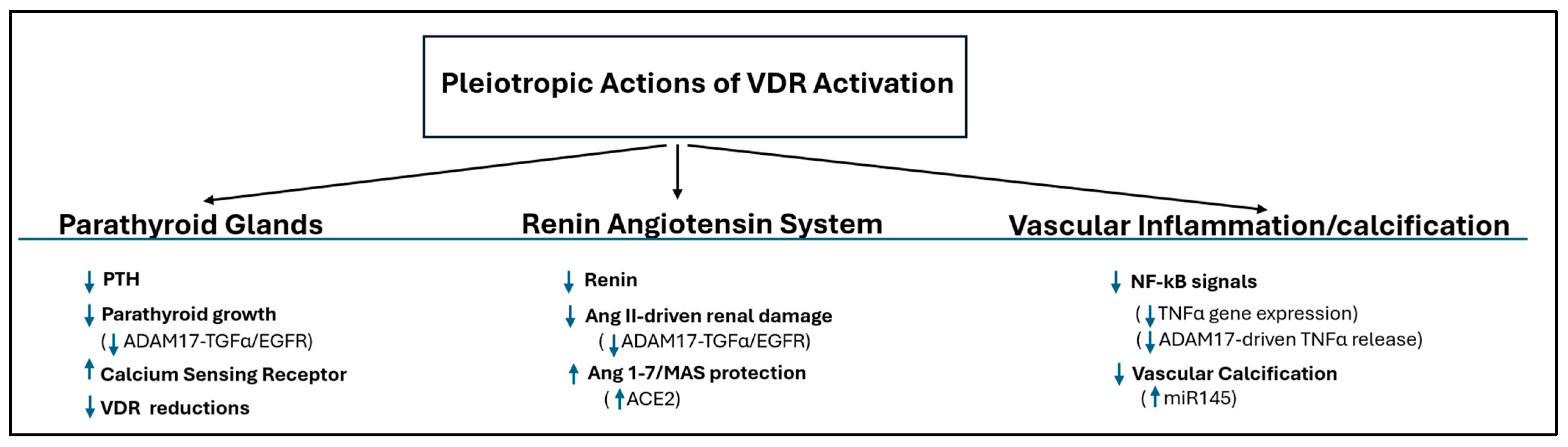 - Inhibition of Parathyroid Growth: Uncontrolled SHPT results from parathyroid hyperplasia. This overgrowth is driven by increases in cyclooxygenase2-prostaglandin E2 and mTOR [14], and also by a powerful autocrine growth loop involving Transforming Growth Factor-alpha (TGF-α) and its receptor, EGFR, which is potently exacerbated by the hyperphosphatemia of advanced CKD [7,15]. The active vitamin D/VDR complex directly counters this vicious cycle at its source by suppressing ADAM17 [16], the enzyme that initiates the loop through the release of TGF-α from the parathyroid cell surface.