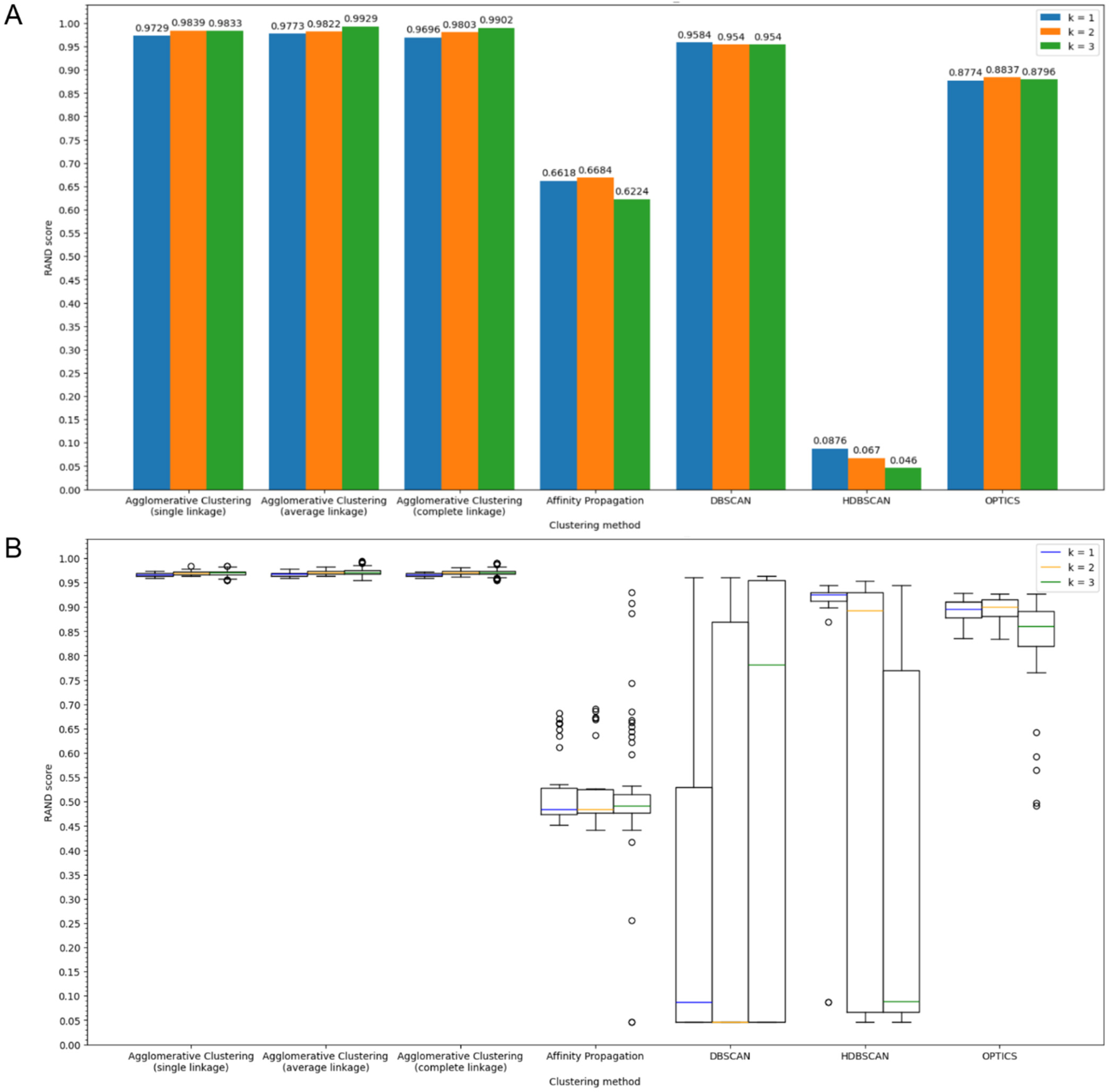 - “Single”, “average” and “complete” clustering linkage parameter values.