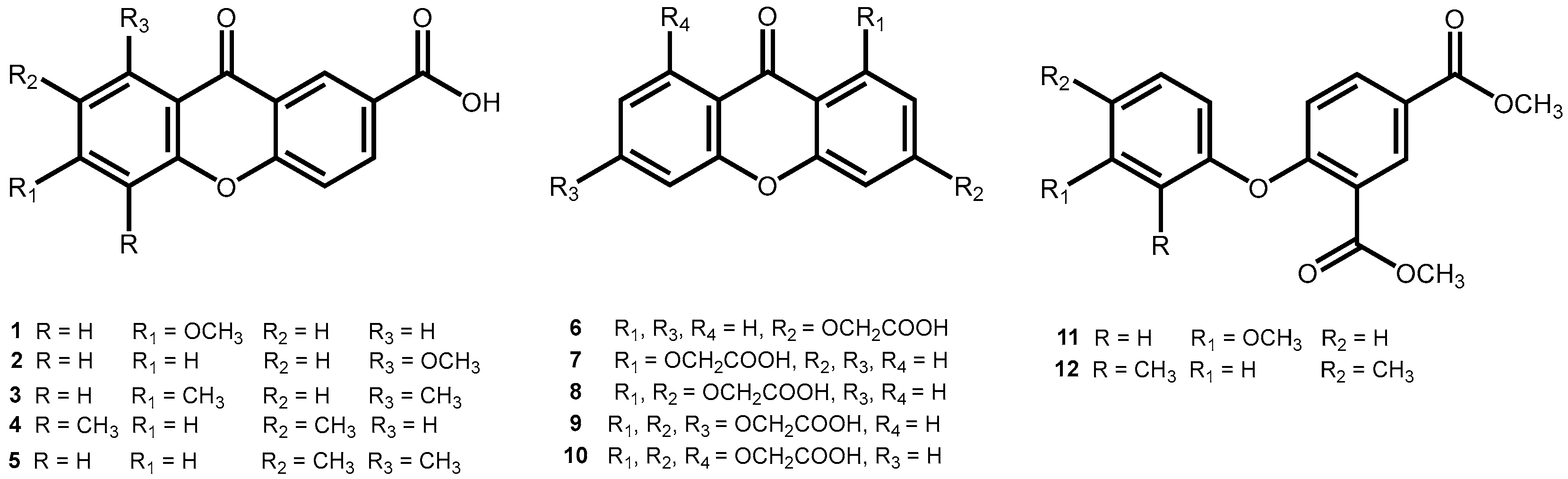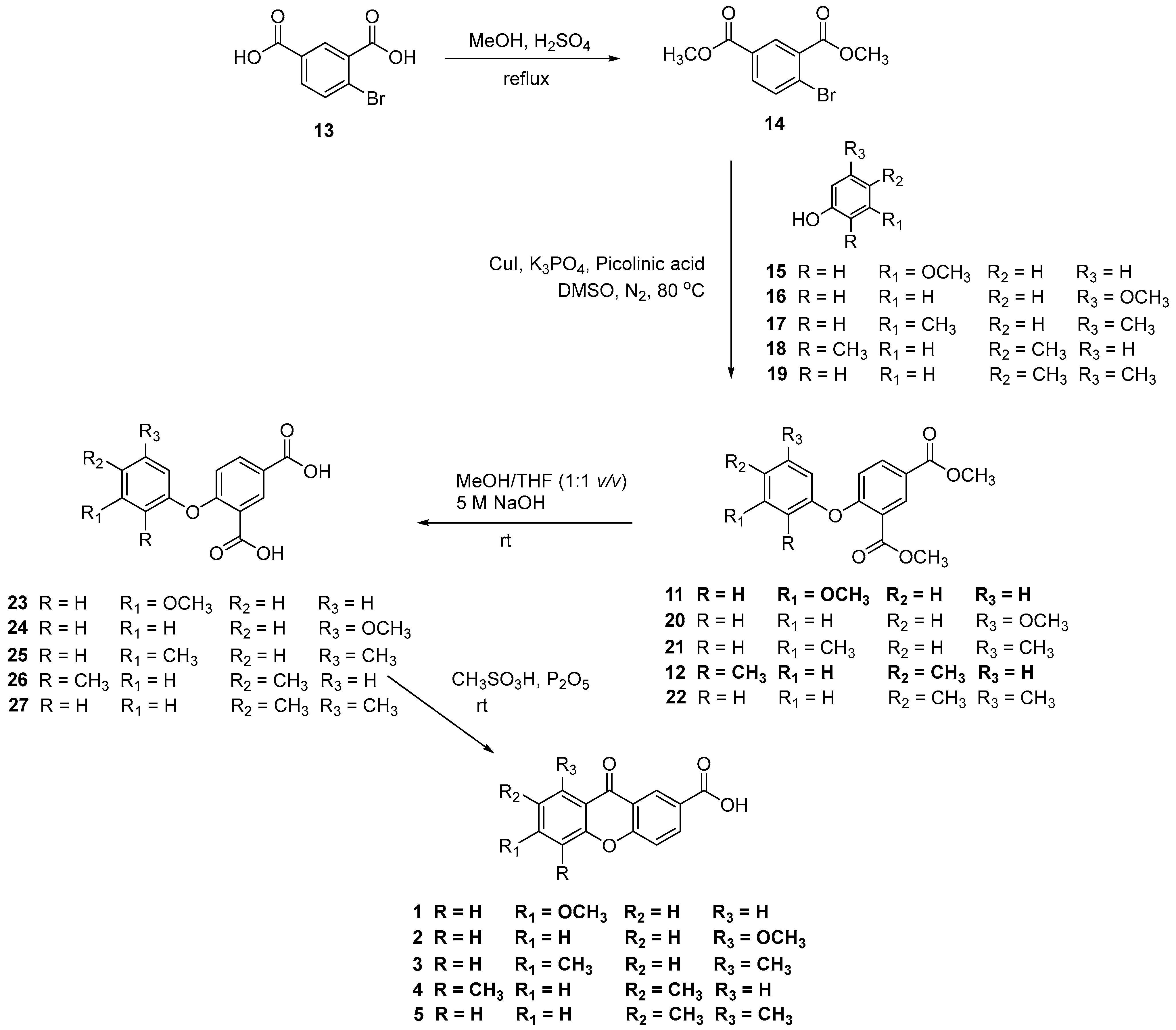 Synthesis of the carboxyxanthone 5,7-dimethyl-9-oxo-9H-xanthene-2-carboxylic acid (4) and intermediate dimethyl 4-(2,4-dimethylphenoxy)isophthalate (12)