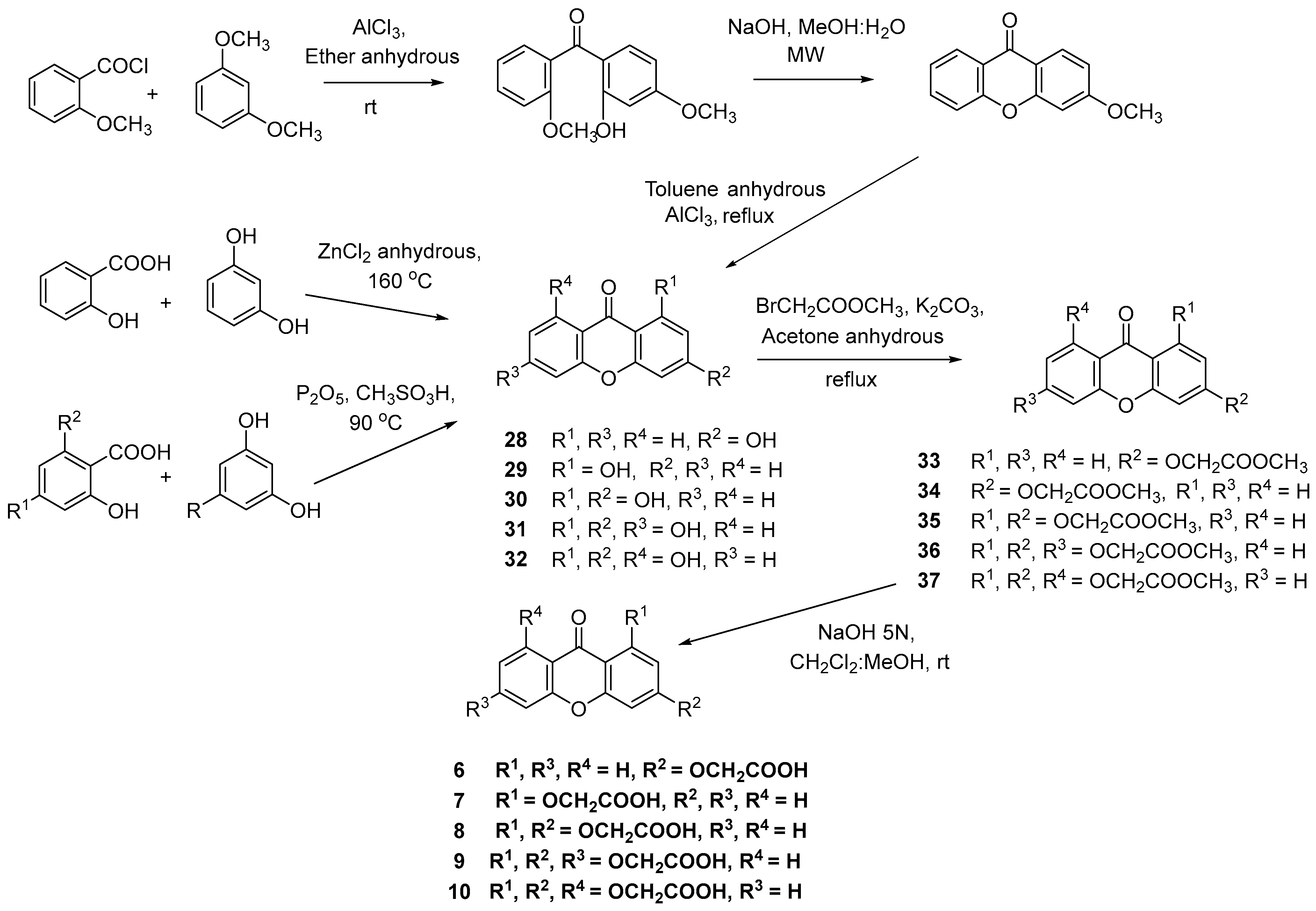 - Carlos Miguel Goncalves, A.; Carlos Manuel Magalhaes, A.; Madalena Maria Magalhaes, P. Routes to Xanthones: An Update on the Synthetic Approaches. Curr. Org. Chem. 2012, 16, 2818–2867. [Google Scholar] [CrossRef]