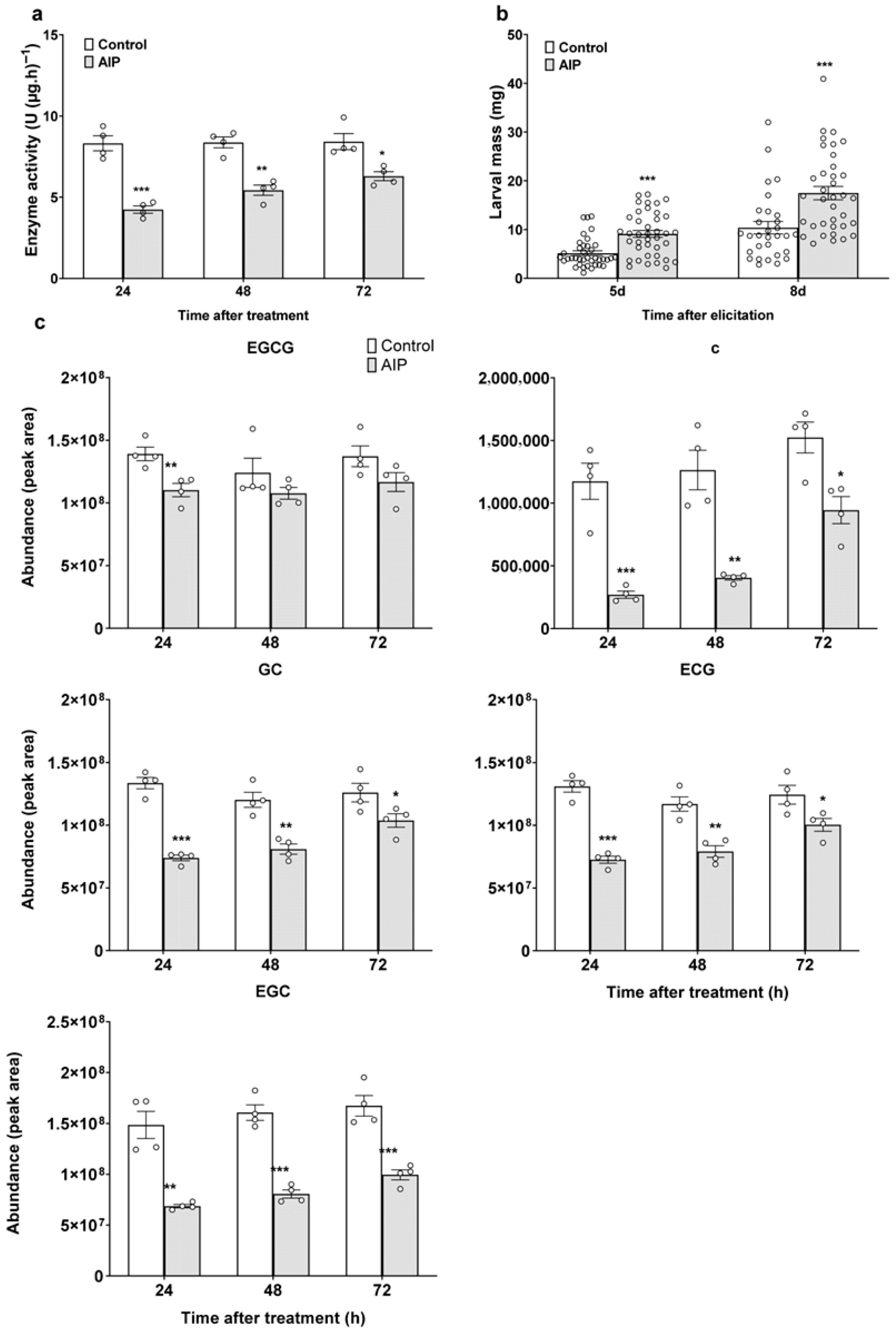- Li, X.; Zhang, J.; Lin, S.; Xing, Y.; Zhang, X.; Ye, M.; Chang, Y.; Guo, H.; Sun, X. (+)-Catechin, Epicatechin and Epigallocatechin Gallate are Important Inducible Defensive Compounds against Ectropis grisescens in Tea Plants. Plant Cell Environ. 2021, 45, 496–511. [Google Scholar] [CrossRef]