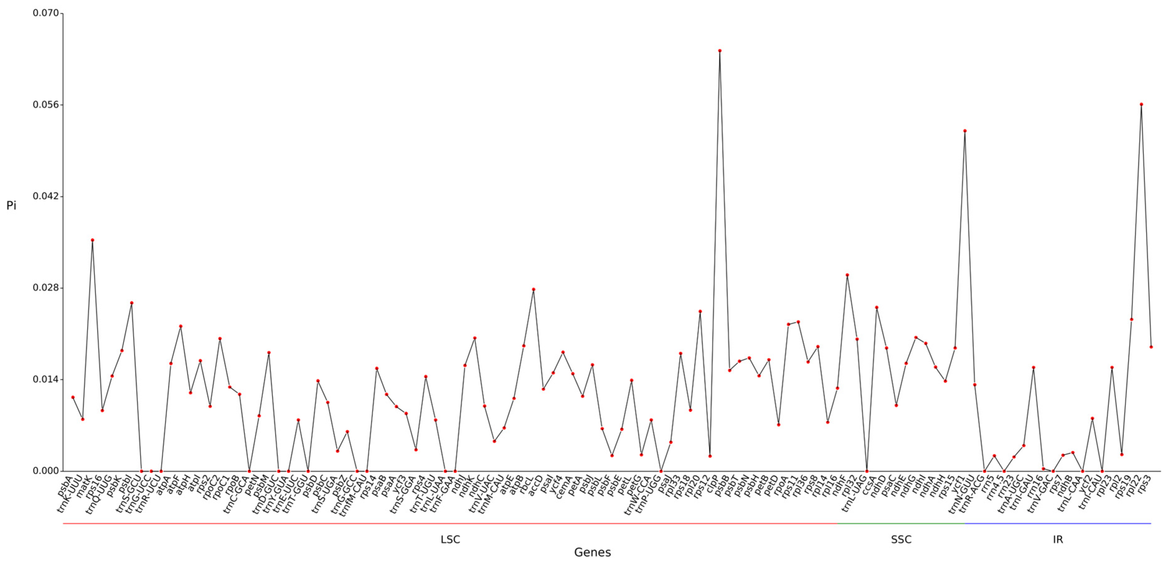 4.4. Selective Pressure and Nucleotide Diversity Analysis