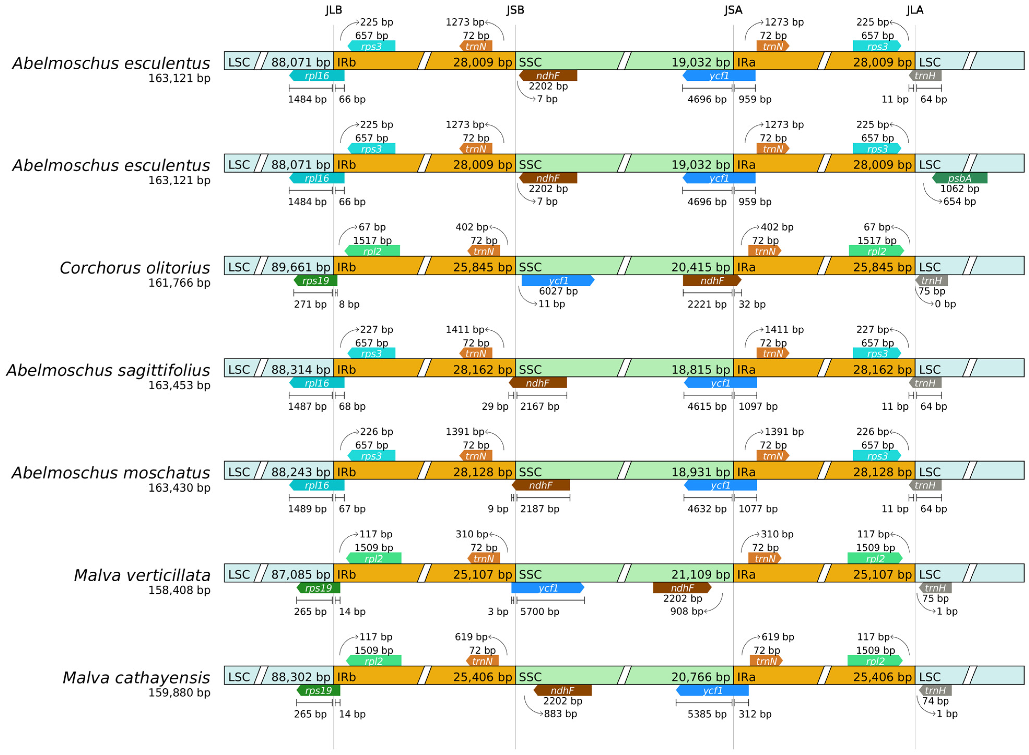 - Li, J.; Ye, G.; Liu, H.; Wang, Z. Complete Chloroplast Genomes of Three Important Species, Abelmoschus moschatus, A. Manihot and A. Sagittifolius: Genome Structures, Mutational Hotspots, Comparative and Phylogenetic Analysis in Malvaceae. PLoS ONE 2020, 15, e0242591. [Google Scholar] [CrossRef]