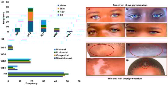 Waardenburg syndrome: characteristic features and spectrum of pigmentation presentations. Panel (a): Hearing loss phenotypes across WS types. Panel (b): Distribution of pigmentation abnormalities (iris, skin, and hair) and dystopia canthorum by WS type. (c–f) shows the array and shades of eyes, hair, and skin pigmentations. Panels (c,d,f) show bilateral blue eyes (hypochromic blue). Panel (e) shows unilateral complete heterochromia iridum (brown right eye and blue left eye). Panels (g–i) depict the depigmentation of skin WS feature presentations (forehead and chest, indicated with the red circles). Panel (j): Premature hair greying (indicated with the red circle). Figure 2c–j images were adapted from our open-access and previously published data (https://www.mdpi.com/2073-4425/16/3/257 and https://www.nature.com/articles/s42003-022-03326-8 accessed on 25 June 2025). WS = Waardenburg syndrome; NR = not reported; DC = dystopia canthorum.