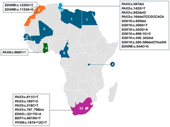 Distribution of reported WS studies by African country, with at least one report (colored). The specific genes and variants identified in affected individuals are indicated. The numbers show the summed reports of Waardenburg syndrome individuals in each country, while different colors are used to differentiate the countries.