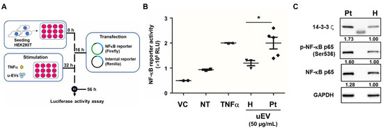 Urinary extracellular vesicles from IC/BPS patients enhance NF-κB activity in HEK293T reporter cells and human bladder epithelial cells. (A) Schematic representation of the dual-luciferase reporter assay workflow. HEK293T cells were seeded at 0 h, transfected with NF-κB reporter (Firefly luciferase) and internal control (Renilla luciferase) plasmids at 16 h, stimulated with uEVs (50 µg/mL) or TNFα (10 ng/mL) at 32 h, and assessed for luciferase activity at 56 h. pGL3-Basic vector lacking NF-κB binding sites served as a negative control. (B) NF-κB activity represented as normalized Firefly/Renilla luciferase ratios. Data are presented as the mean ± SEM. Statistical significance was determined between the indicated groups: *, p < 0.05. (C) Here, 50 µg/mL of uEVs from a healthy donor (H) or an IC patient (Pt) was used to treat human bladder epithelial cells (HBlEpC) for 48 h. The protein expressions of 14-3-3ζ, p-NF-κB p65 at serine536, and total NF-κB p65 were determined via Western blot. GAPDH was used as an internal protein loading control. The numbers below the blots indicate expression levels relative to H uEV–treated cells after normalization to GAPDH.