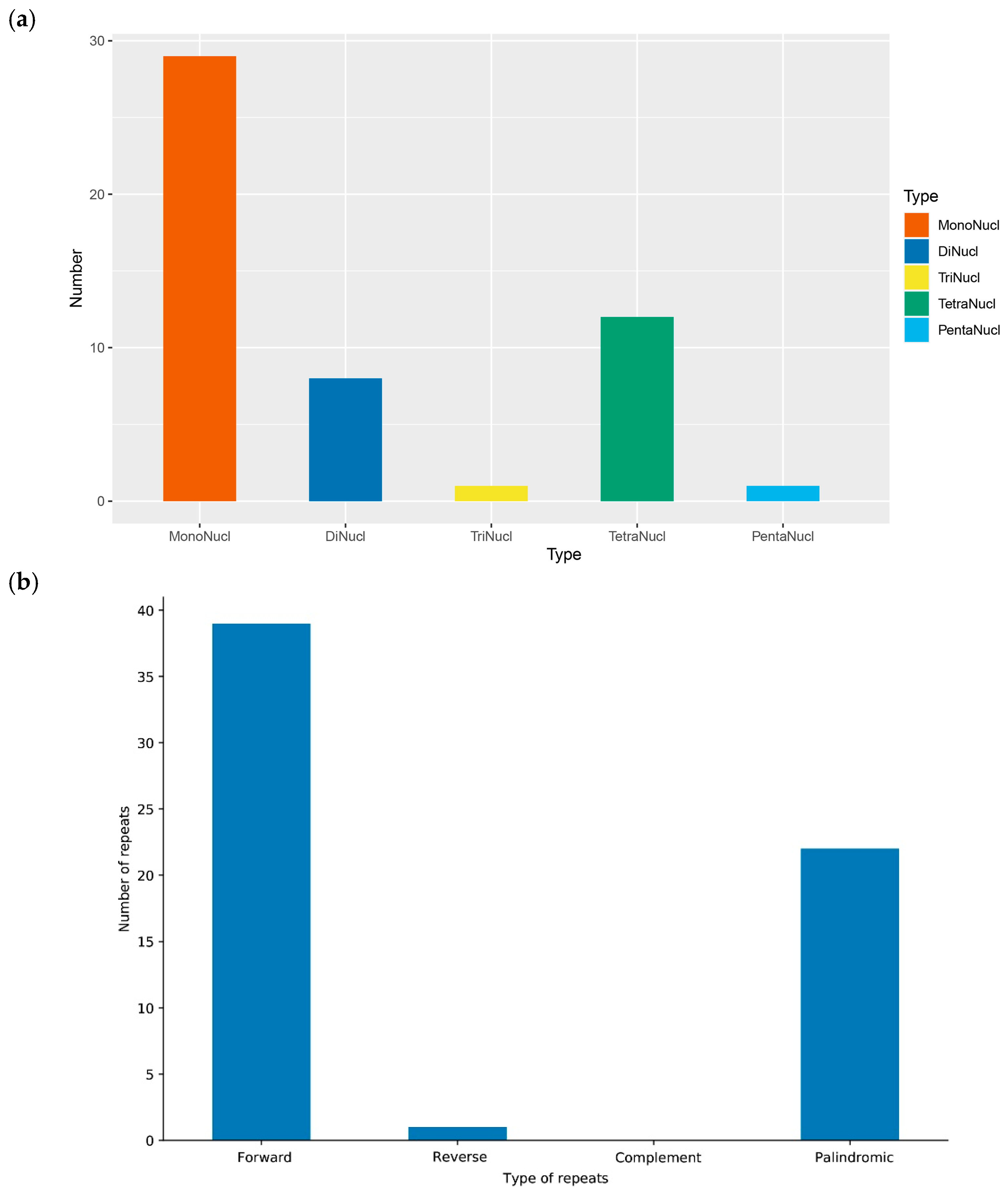 3.1. Genomic Architecture and Repetitive Elements of the P. bisulcatum Chloroplast Genome