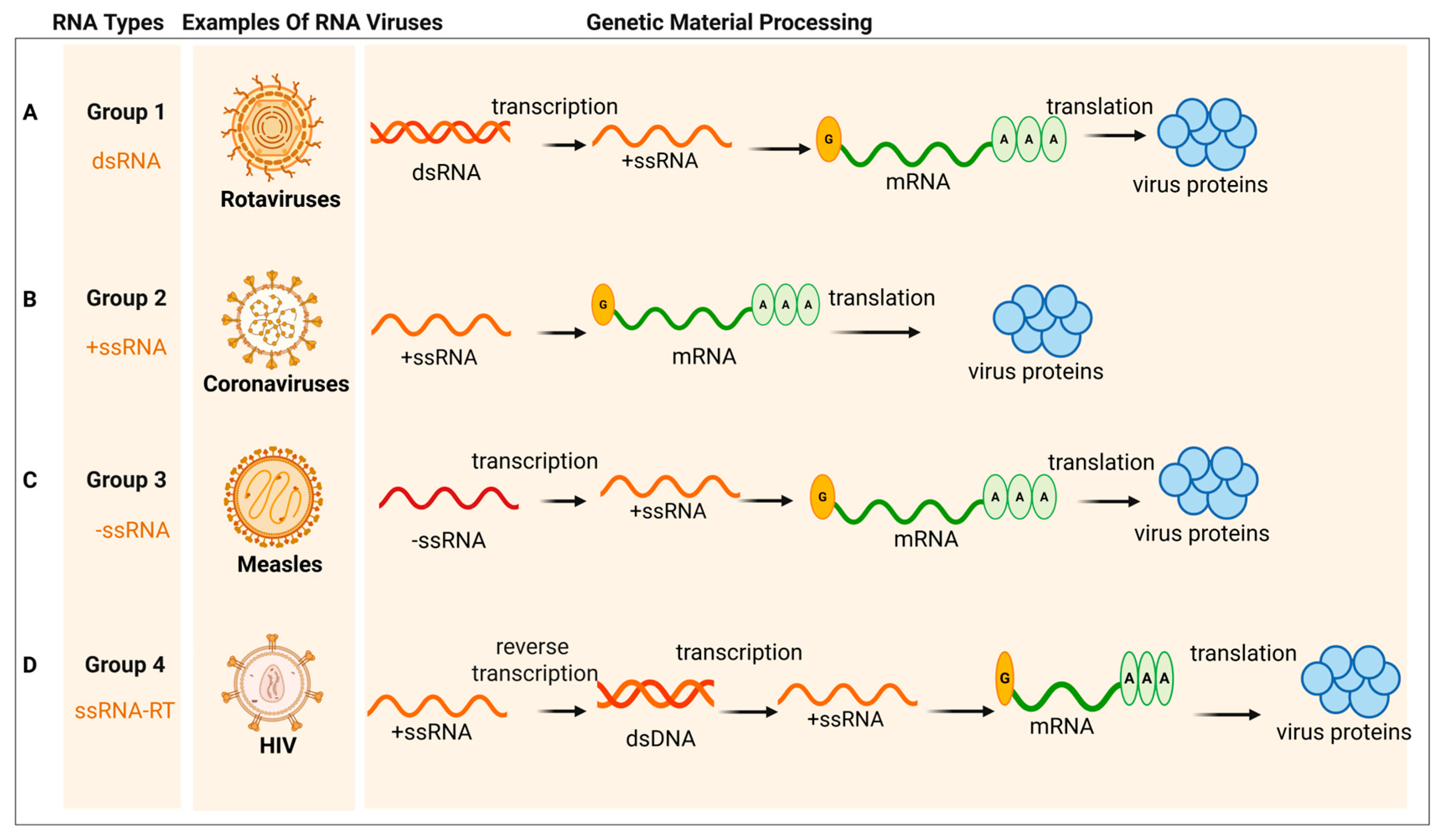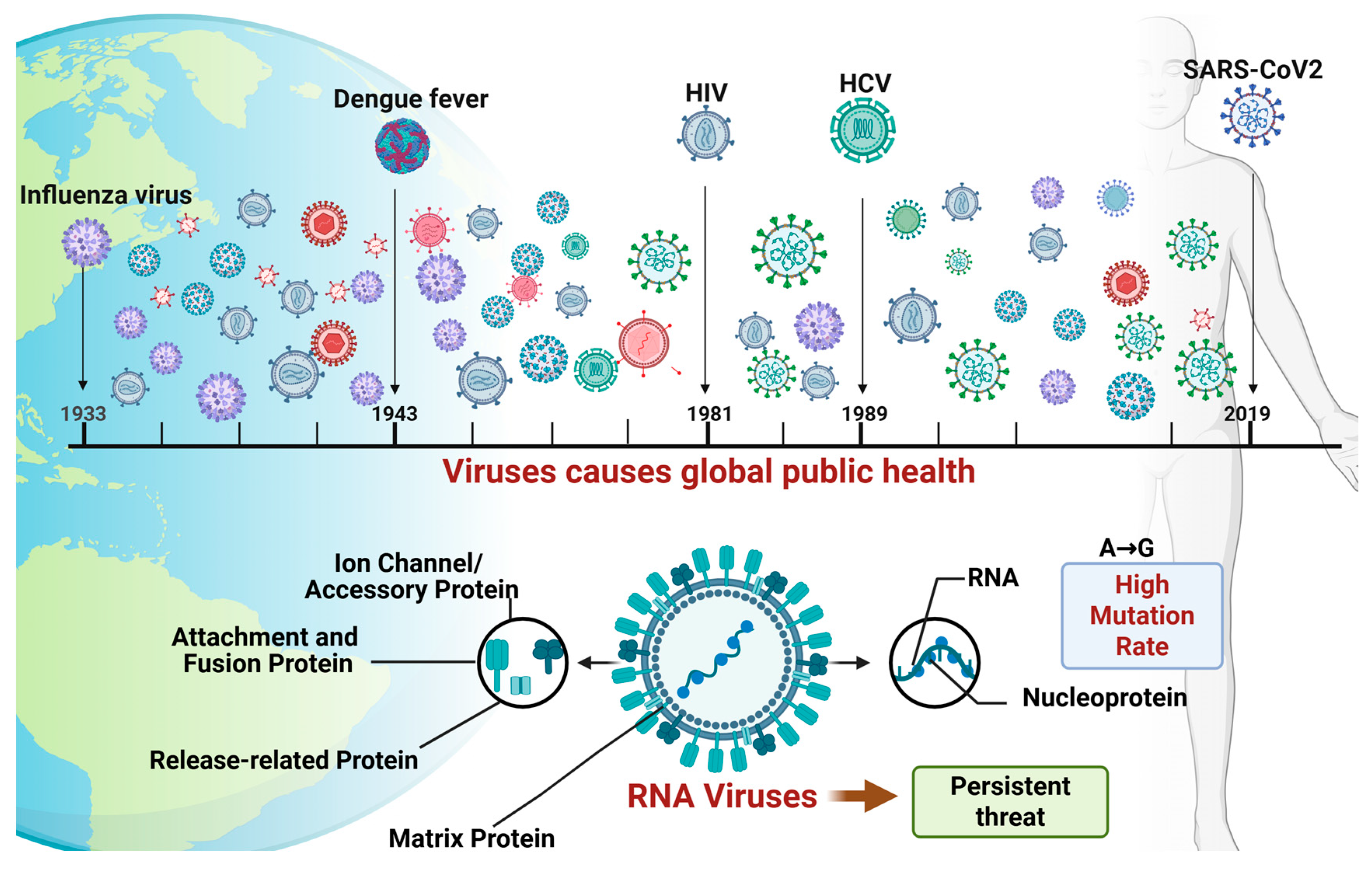 - Zhang, F.; Tang, Y.; Jia, Y.; Zhou, Y. RNA viruses: From RNA processing and interaction mechanisms to new prevention and control strategies. Sci. Sin. Vitae 2025, 55, 1851–1876. [Google Scholar] [CrossRef]