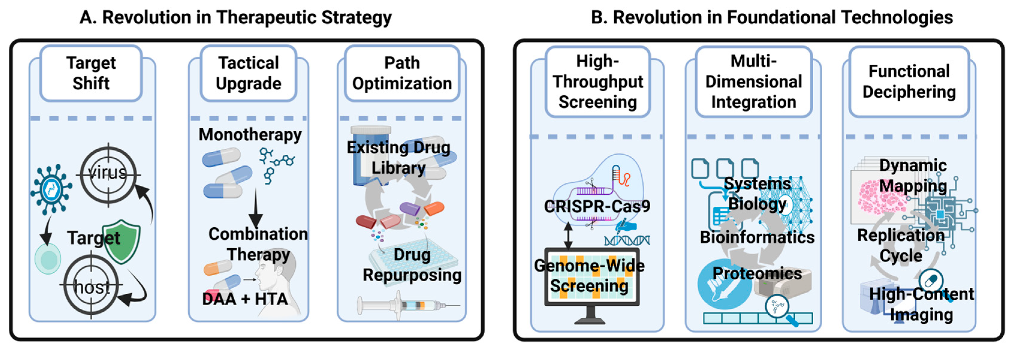- Precision in Target Identification: The next generation of HDFs will be discovered by focusing on those that are “preferentially hijacked” by viruses or become essential only in infected cells. Leveraging functional genomics, proteomics, and AI-driven analytics will be key to identifying these ideal targets with inherently higher therapeutic indices (Figure 5B).