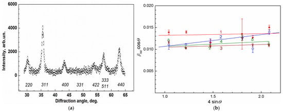 Panel (a) presents X-ray diffraction intensity vs. diffraction angle for ferrocellulose microspheres with the sizes ~100 μm. The nominal reflections for magnetite are presented below the peaks. Panel (b) displays the treatment of the data with Williamson–Hall formula for: (1) MSCMN_100 (red filled squares and line); (2) MSCMN_700 (blue open circles and line); (3) MNP_no-shell (open green triangles) and (4) MNP_Dx (filled brown reverse triangles), respectively.