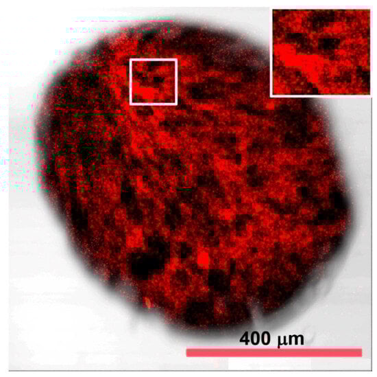 A confocal image of MSCMN_700 with MNPs and an average size of 700 μm illuminated by quantum dots is shown in Figure 3. As it is seen, high light absorption is observed due to the presence of the MNPs in internal pores. The porous structure of the microspheres is confirmed by uneven distribution of quantum dots observed in the figure. The presence of numerous entrances to the internal pores of the microsphere is clearly visible in Figure 3 as regions without bound quantum dots on its surface and indicates a large number of pores inside.