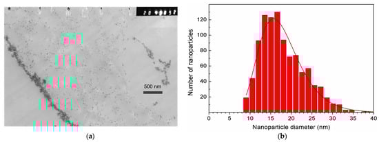 TEM image of a section of the MSCMN_700, (a). The measured distribution of MNP diameters inside the microsphere with a statistical sample of n = 1000 (histogram) and its best fit to the lognormal distribution (solid line) (b).