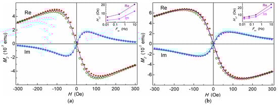 Real and imaginary parts of M2 response as functions of dc magnetic field from suspensions of MSCMN_100, CFe = 503 μg/mL (a) and from the sample with 15 MSCMN_700, CFe = 16.6(4.4) μg/mL (b) in water at room temperature registered at Fsc = 0.25 Hz and ac-field amplitudes of 2.8 Oe and 14 Oe, respectively. The solid curves are best fits. Filled and open symbols present direct and reverse H scans, accordingly. Every 40th point is shown. Insets show the dependences of the field hysteresis width (“coercive force” Hc2) for ReM2(H) on the H-scan frequency.