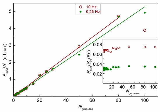 The samples containing MSCMN_700 with the number of microspheres from one to one hundred synthesized using pre-prepared MNPs were examined at the NLR-M2 device as well. The moduli of the integral recorded signals normalized by h2 for the scan frequencies 0.25 and 10 Hz are shown in Figure 7. The linear dependence demonstrates an additive character of the signal. The inset shows the ratios of the square of the hysteresis loop to the modulus of the M2 signal. This quantity is almost independent of the number of microspheres. Together with the linear increase in the integral signal this indicates the absence of any magnetic coupling of the microspheres. The increase in the H-scan period from 100 ms to 4 s is accompanied by the decrease in the hysteresis by two times, suggesting dynamic nature of the hysteresis and, hence, the single-domain state of the MNPs inside the microspheres.