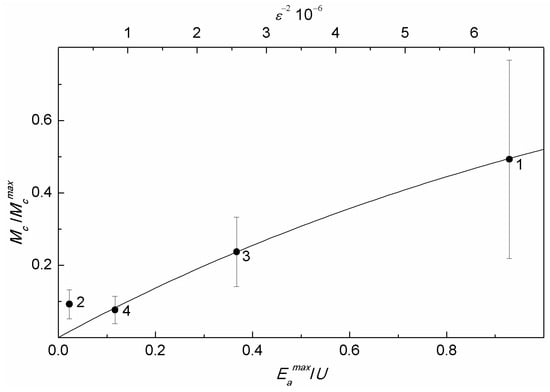 Unexpectedly, the average magnetic moment of MNPs in MSCMN_700 obtained from the magnetic measurements (Table 3), turned out to be smaller (~1.4 × 104 μB) than the magnetic moment of MNPs in MSCMN_100 (~2 × 104 μB, Table 2), despite the larger size of the former (Table 1). This results from considerable microcrystal strains suppressing the MNP magnetism. The decrease in the nanoparticle magnetization down to 25% and lower compared to the bulk value was also observed in a number of MNPs, including magnetite, with microcrystal strains of the same order ε~10−3 [43]. Unstrained bulk magnetite has cubic crystal symmetry with the magnetic moment directed along the main diagonal of the unit cell. MNP microcrystal strains distort the local symmetry, resulting in redirecting the easy axes of magnetization. These uncorrelated lattice distortions partially disorder local magnetic moments, decreasing the total moment of a nanoparticle. For the four samples studied, with occasionally different microcrystal strains, this effect is presented in Figure 8 via the dependence of the normalized mean MNP magnetic moment on the factor Here, the magnetic moment was obtained from the NLR-M2 measurements and is the estimated magnetic moment corresponding to the mean volume , but with the magnetization of single-crystal magnetite at room temperature 0.08 Am2/g [43]. The corresponding diameter is , with d estimated from the XRD measurements and the size distribution width , with obtained also from the NLR-M2 measurements. Note that the so obtained normalized magnetic moment is somewhat underestimated, as was assessed without account of the demagnetization effect.