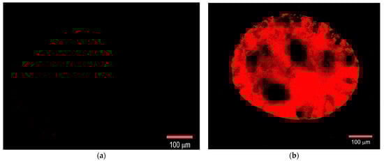 The biological activity of the TKD peptide in the TKD@MSCMN conjugate after immobilization was verified using co-incubation of the conjugates with Hsp70 stained with Flamma648, (see Section 3.12). Visualization was performed in the red channel of a fluorescence microscope and is shown in Figure 10. The signal from the target conjugate presented in panel (b) demonstrates the presence of Hsp70 in the complex. The sorption of Hsp70 by the control conjugate with the ALL peptide was absent, as is seen in Figure 10a.