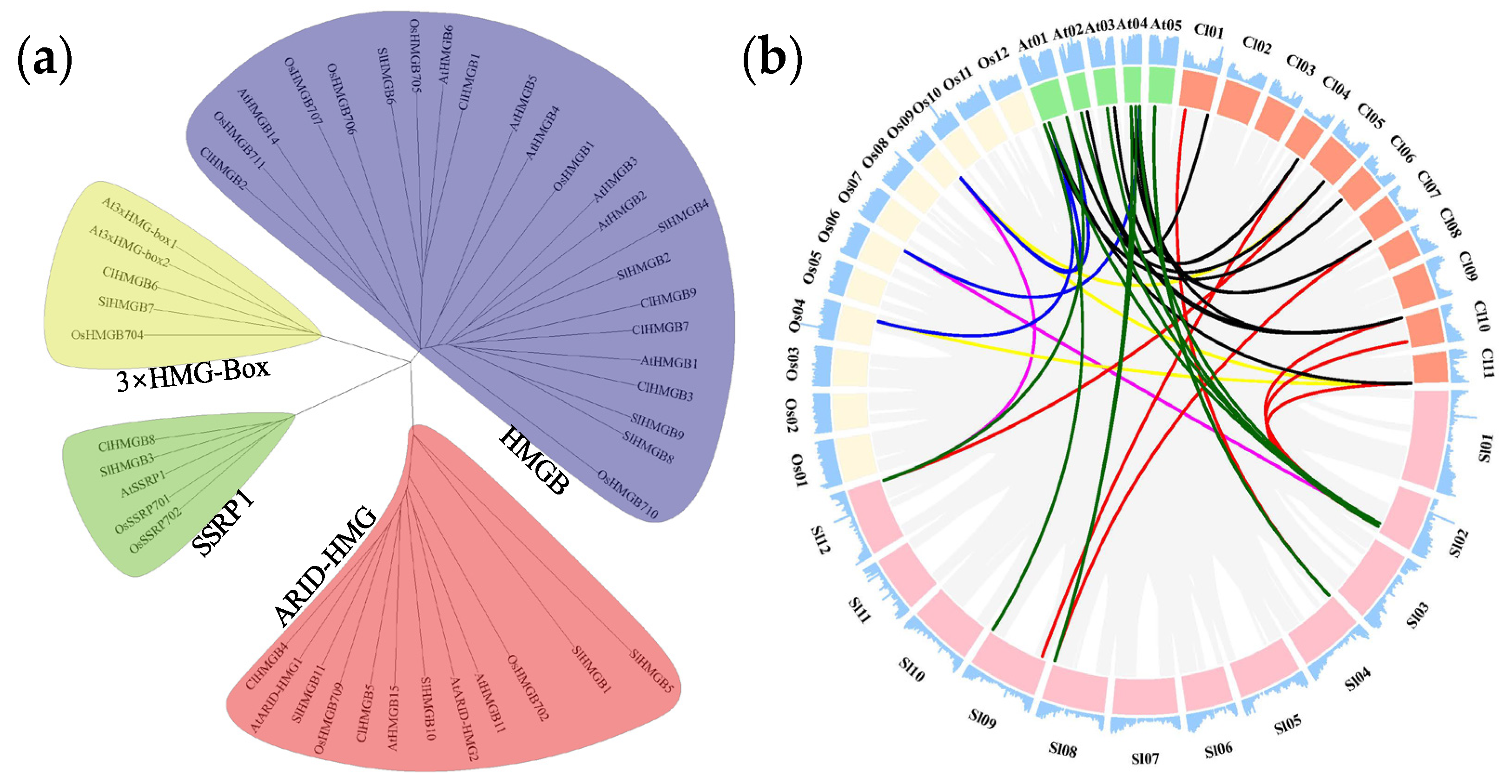 - Zheng, J.; Tang, H.; Wang, J.; Liu, Y.; Ge, L.; Liu, G.; Shi, Q.; Zhang, Y. Genome-Wide Identification and Expression Analysis of the High-Mobility Group B (HMGB) Gene Family in Plant Response to Abiotic Stress in Tomato. Int. J. Mol. Sci. 2024, 25, 5850. [Google Scholar] [CrossRef]