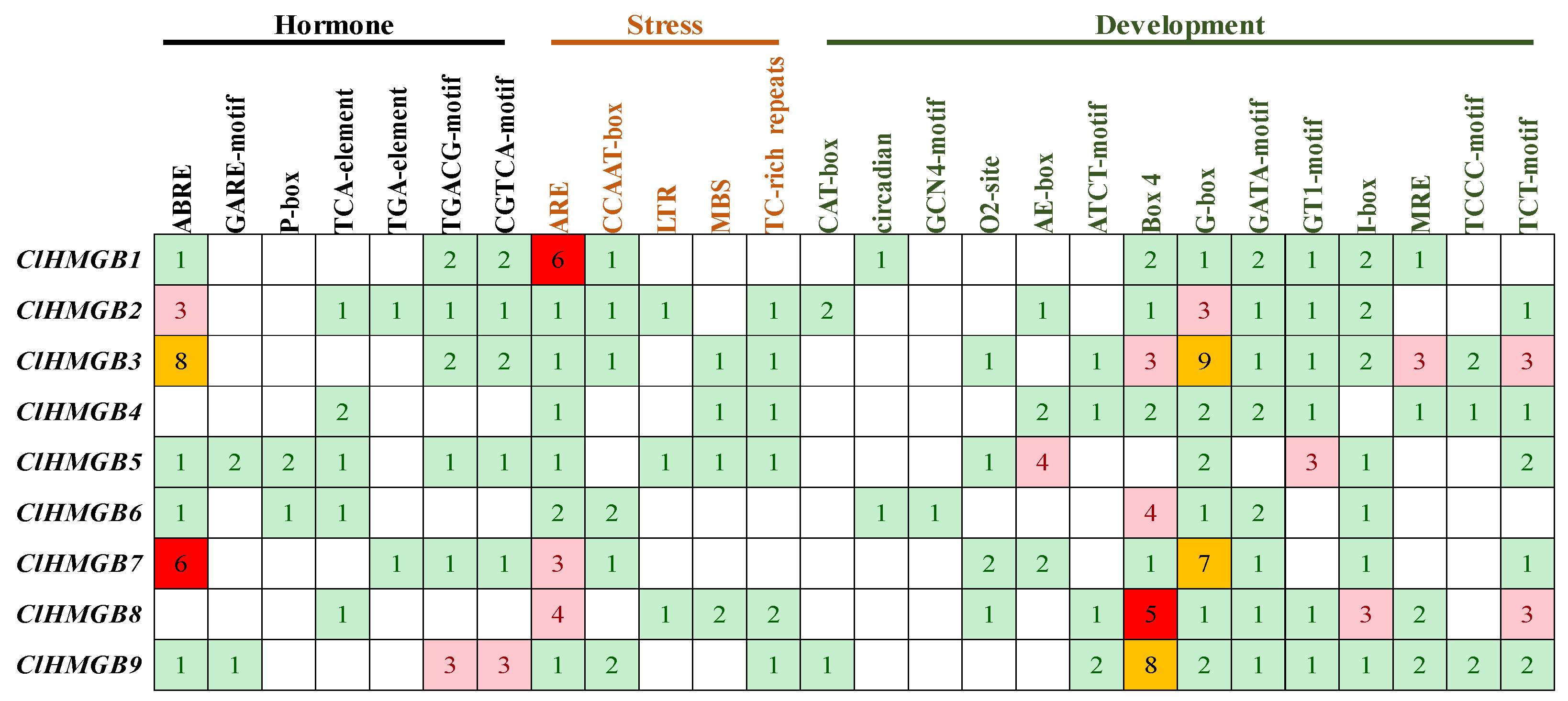 2.3. Gene Structure, Conserved Domains and Cis-Acting Regulatory Elements of the ClHMGBs