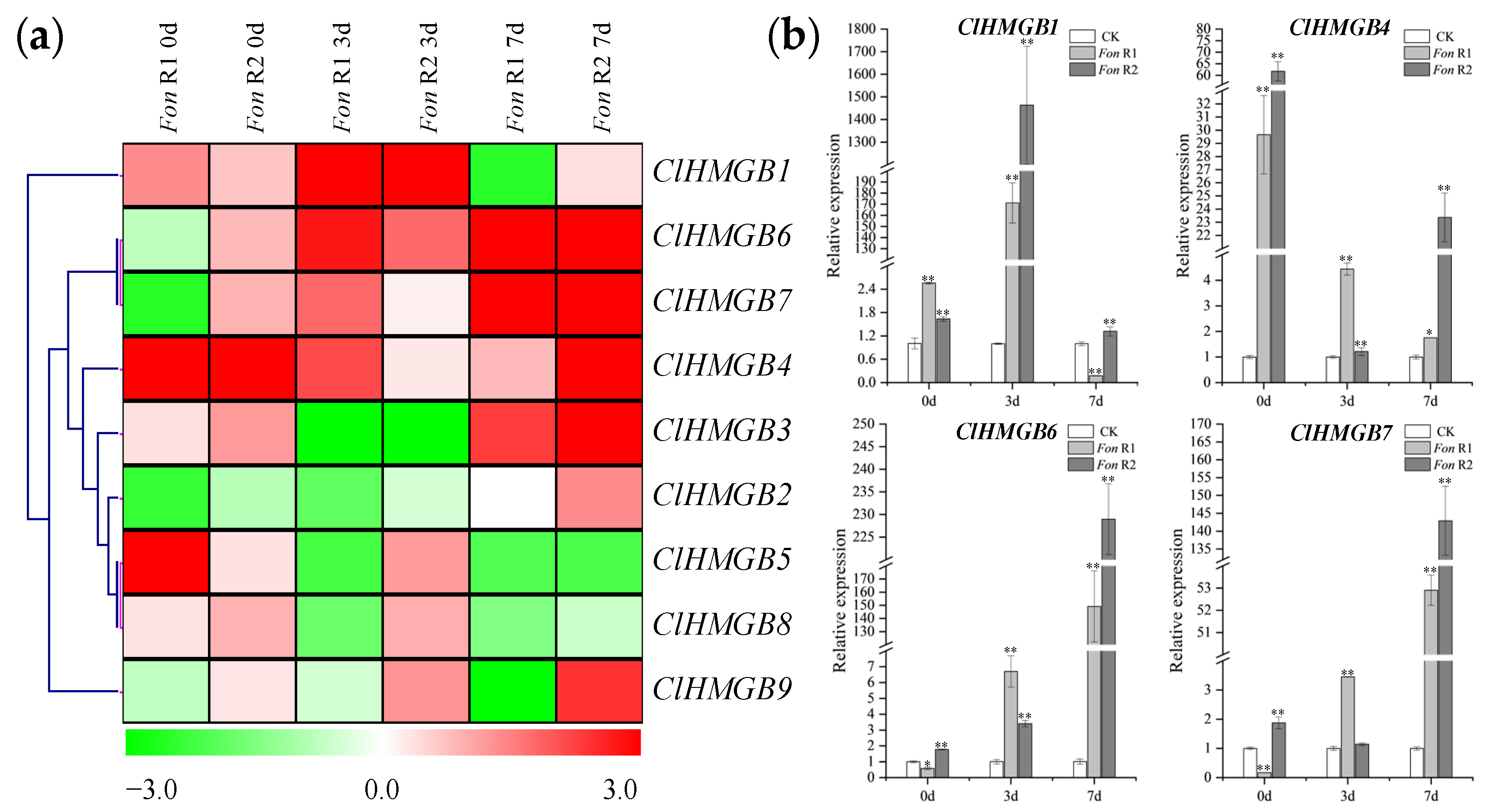 Chicago/Turabian StyleXuan, Changqing, Mengli Yang, Yufan Ma, Xue Dai, Shen Liang, Gaozheng Chang, and Xian Zhang. 2026. "Genome-Wide Identification and Expression Analysis of the ClHMGB Gene Family in Watermelon Under Abiotic Stress and Fusarium oxysporum Infection" International Journal of Molecular Sciences 27, no. 1: 157. https://doi.org/10.3390/ijms27010157