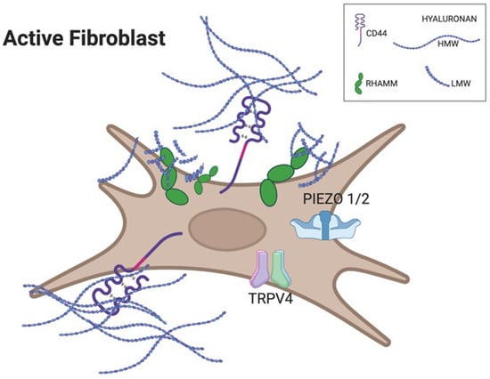 Cartoon of an active fibroblast illustrating differential receptor engagement by hyaluronan fragments. Long HMW-HA chains preferentially bind and cluster CD44 at the cell surface, promoting structural integrity and anti-inflammatory signaling. Short LMW-HA fragments accumulate around RHAMM and stimulate mechanosensitive ion channels TRPV4 and PIEZO1/2, driving Ca2+ entry and initiating YAP-dependent transcriptional responses linked to fibrosis. Created with BioRender.com, accessed on 11 November 2025.