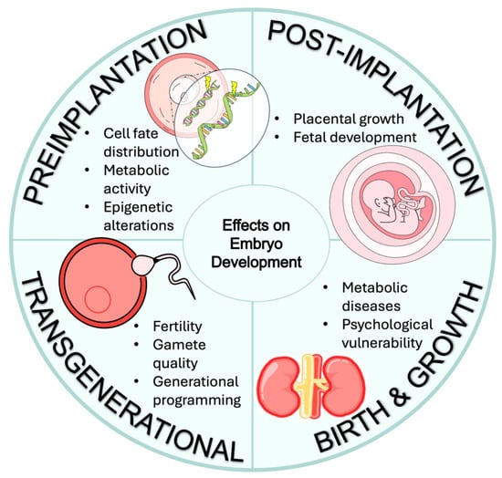 As mentioned earlier, the DOHaD framework posits that adult health is shaped not only by inherited genetics but also by environmental conditions experienced during early development. Although fetal and neonatal periods have historically been considered primary windows of vulnerability, mounting evidence extends this sensitivity back to the preimplantation stage—the short but highly dynamic interval between fertilization and implantation—during which the embryo undergoes profound molecular and cellular transitions [100]. Furthermore, it has been reported that culture conditions themselves, such as in vitro culture, also affect gene expression in early embryos [101], and differences in culture medium composition may influence developmental timing and the expression profile.