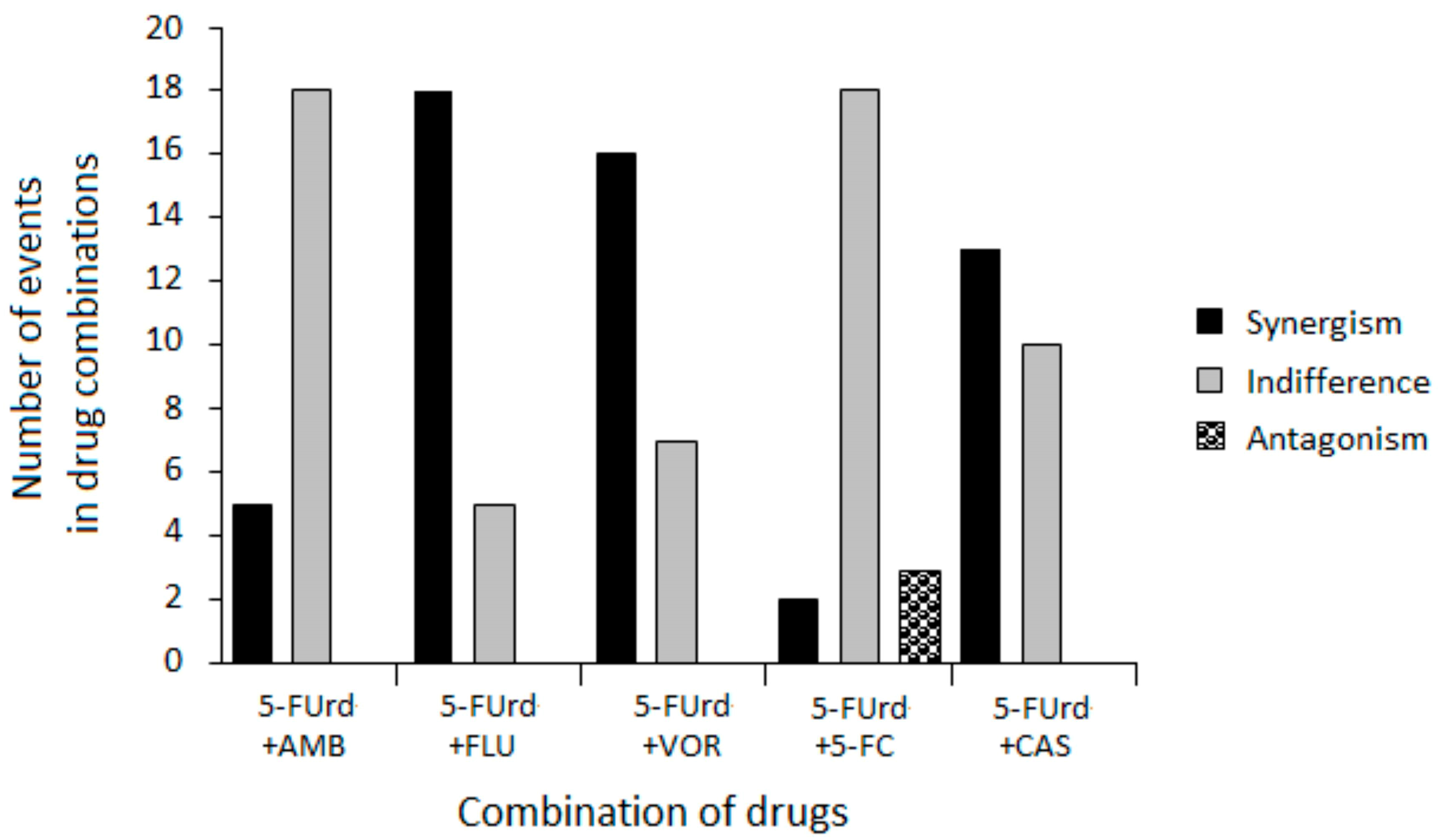 | 16 | 5-FUrd + AMB 5-FUrd + FLU 5-FUrd + VOR 5-FUrd + 5-FC 5-FUrd + CAS | 0.5 0.125 0.5 1 1 | 0.5 0.125 0.031 4 1 | 1 0.25 0.531 5 0.5 | Indifference Synergism Indifference Antagonism Indifference |
