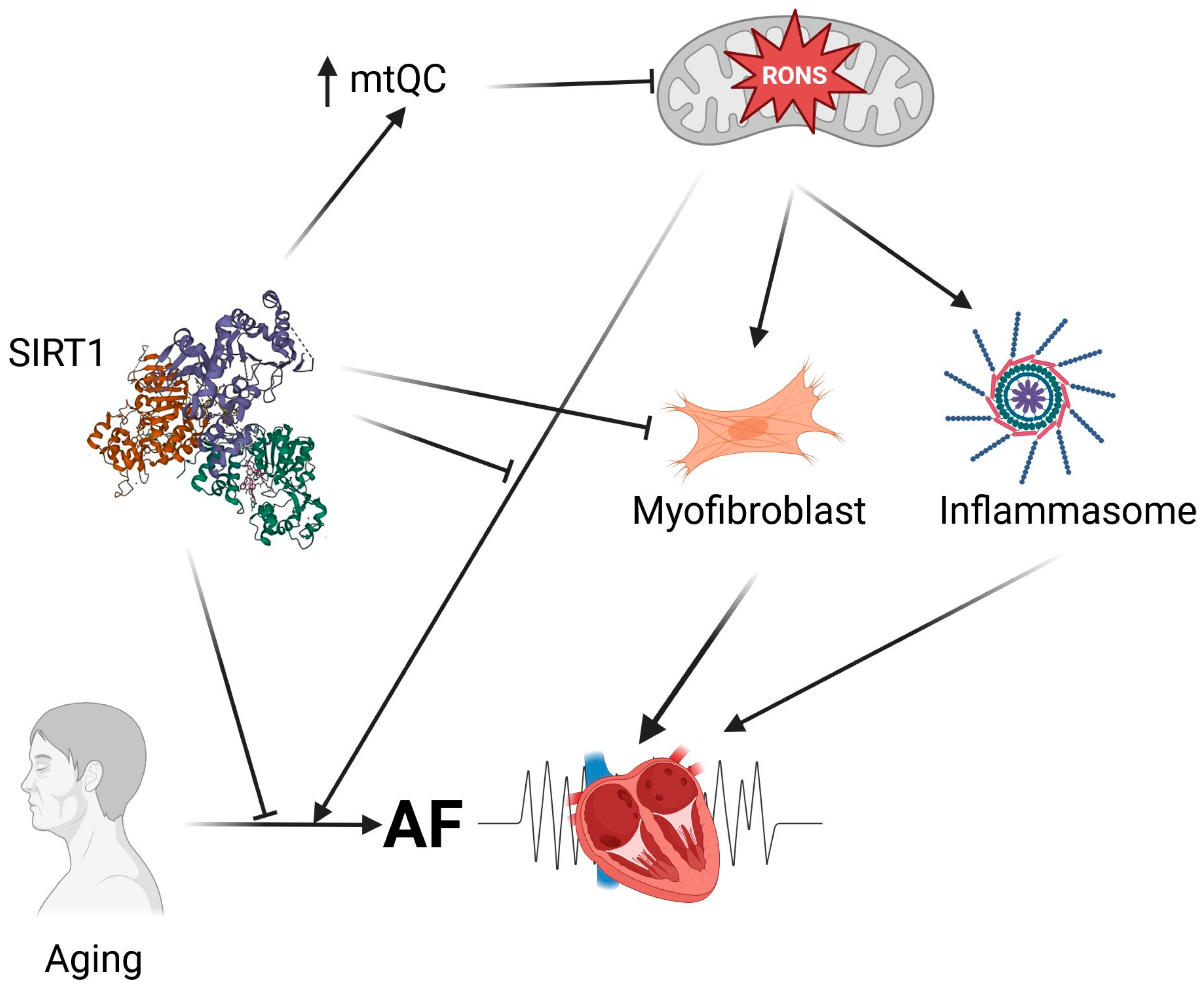 - Jin, X.; Zhang, Y.; Zhou, Y.; Luo, Y.; Han, X.; Gao, Y.; Yu, H.; Duan, Y.; Shi, L.; Wu, Y.; et al. Sirt1 Deficiency Promotes Age-Related AF Through Enhancing Atrial Necroptosis by Activation of RIPK1 Acetylation. Circ. Arrhythmia Electrophysiol. 2024, 17, e012452. [Google Scholar] [CrossRef]
