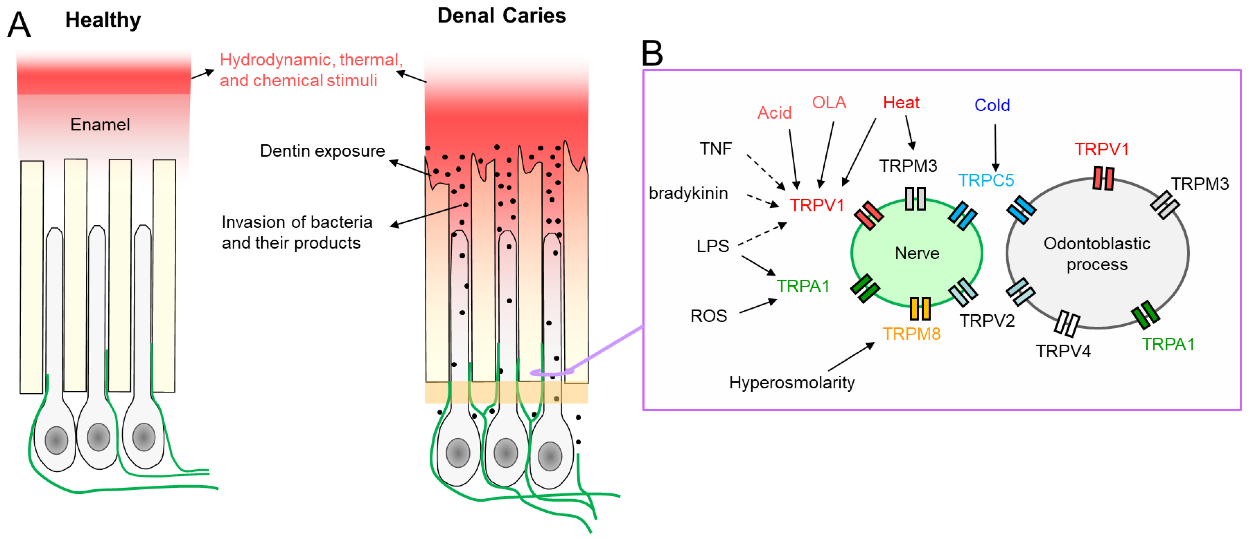 - Lee, K.; Lee, B.M.; Park, C.K.; Kim, Y.H.; Chung, G. Ion Channels Involved in Tooth Pain. Int. J. Mol. Sci. 2019, 20, 2266. [Google Scholar] [CrossRef] [PubMed]