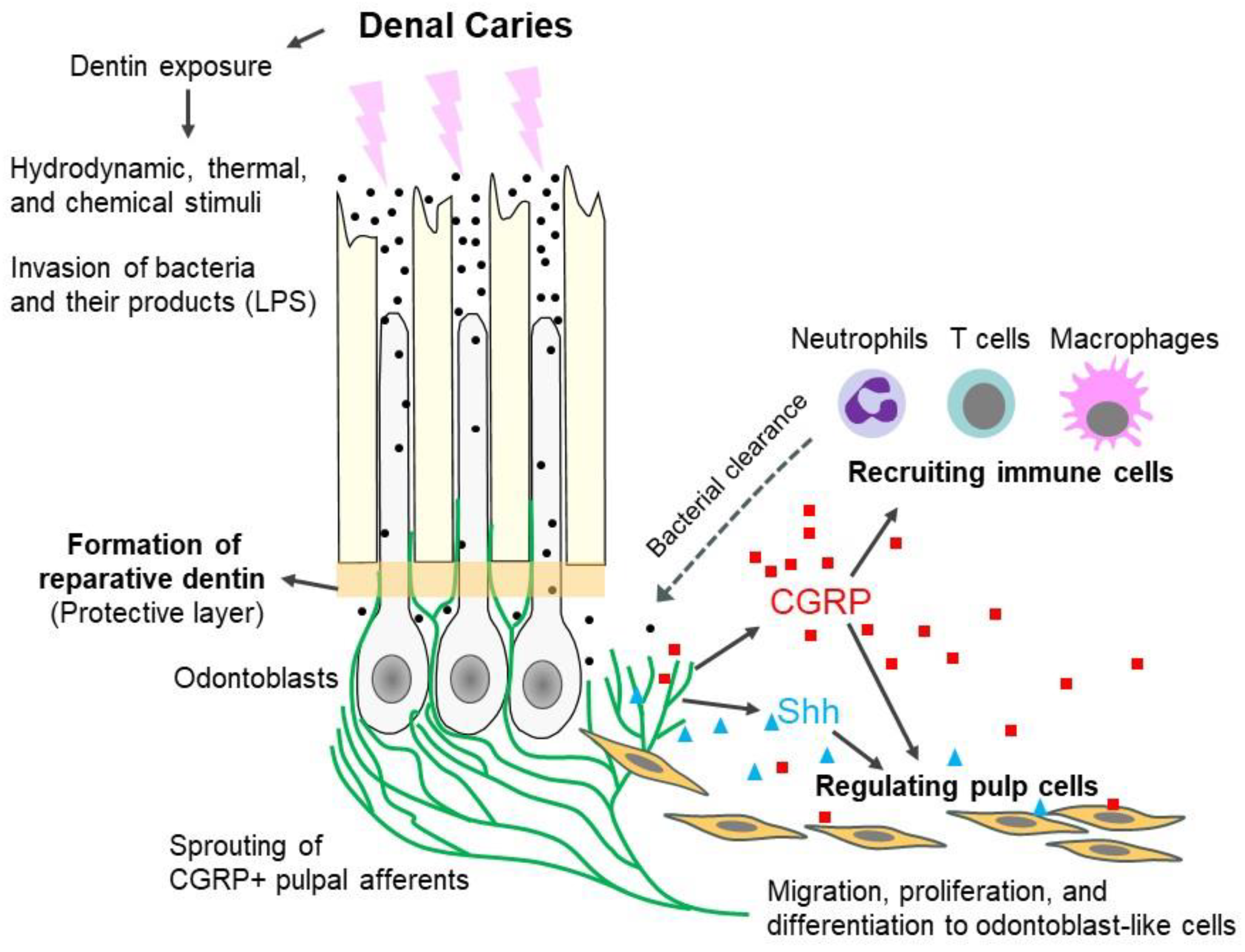 - Moore, E.R.; Michot, B.; Erdogan, O.; Ba, A.; Gibbs, J.L.; Yang, Y. CGRP and Shh Mediate the Dental Pulp Cell Response to Neuron Stimulation. J. Dent. Res. 2022, 101, 1119–1126. [Google Scholar] [CrossRef]