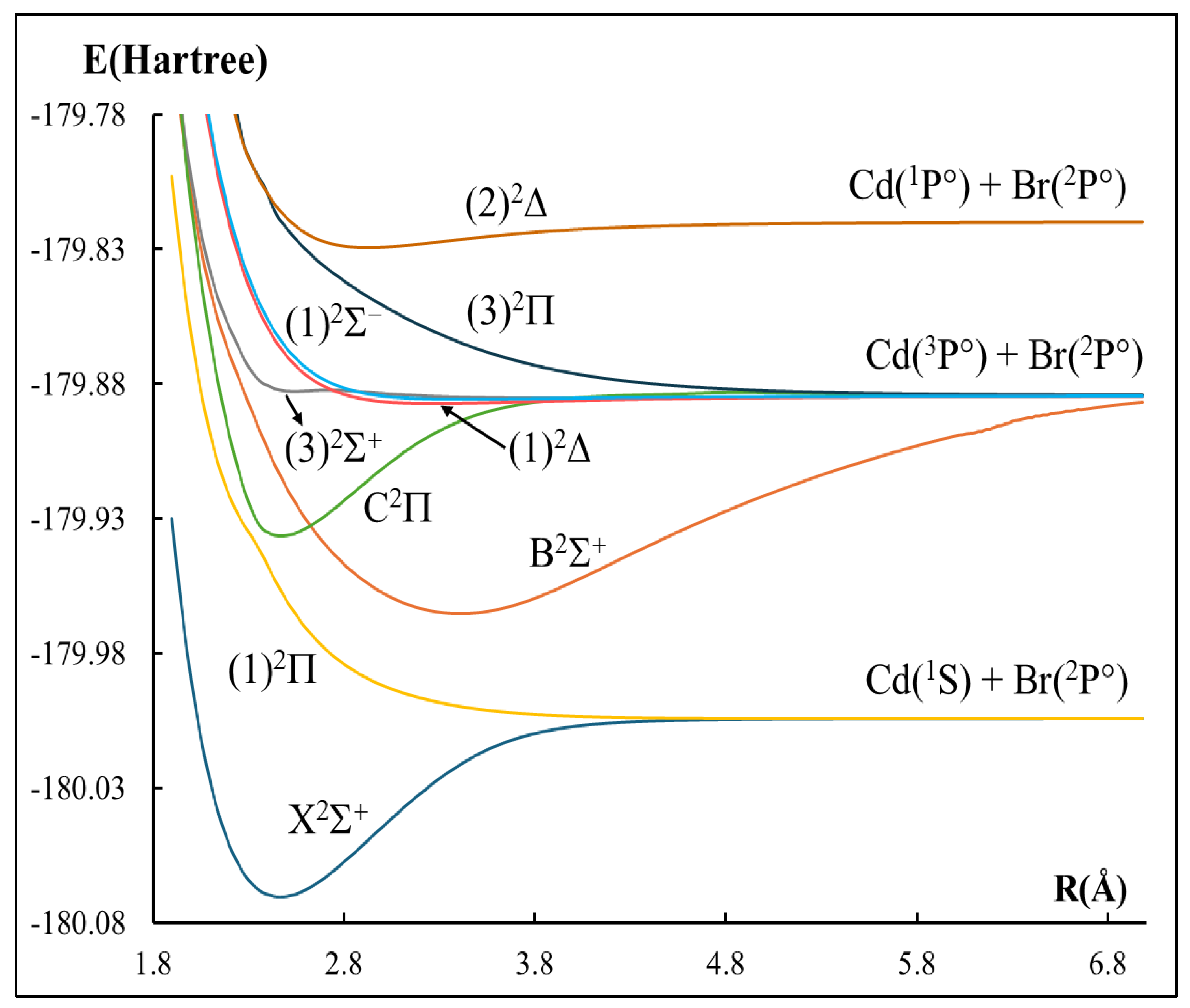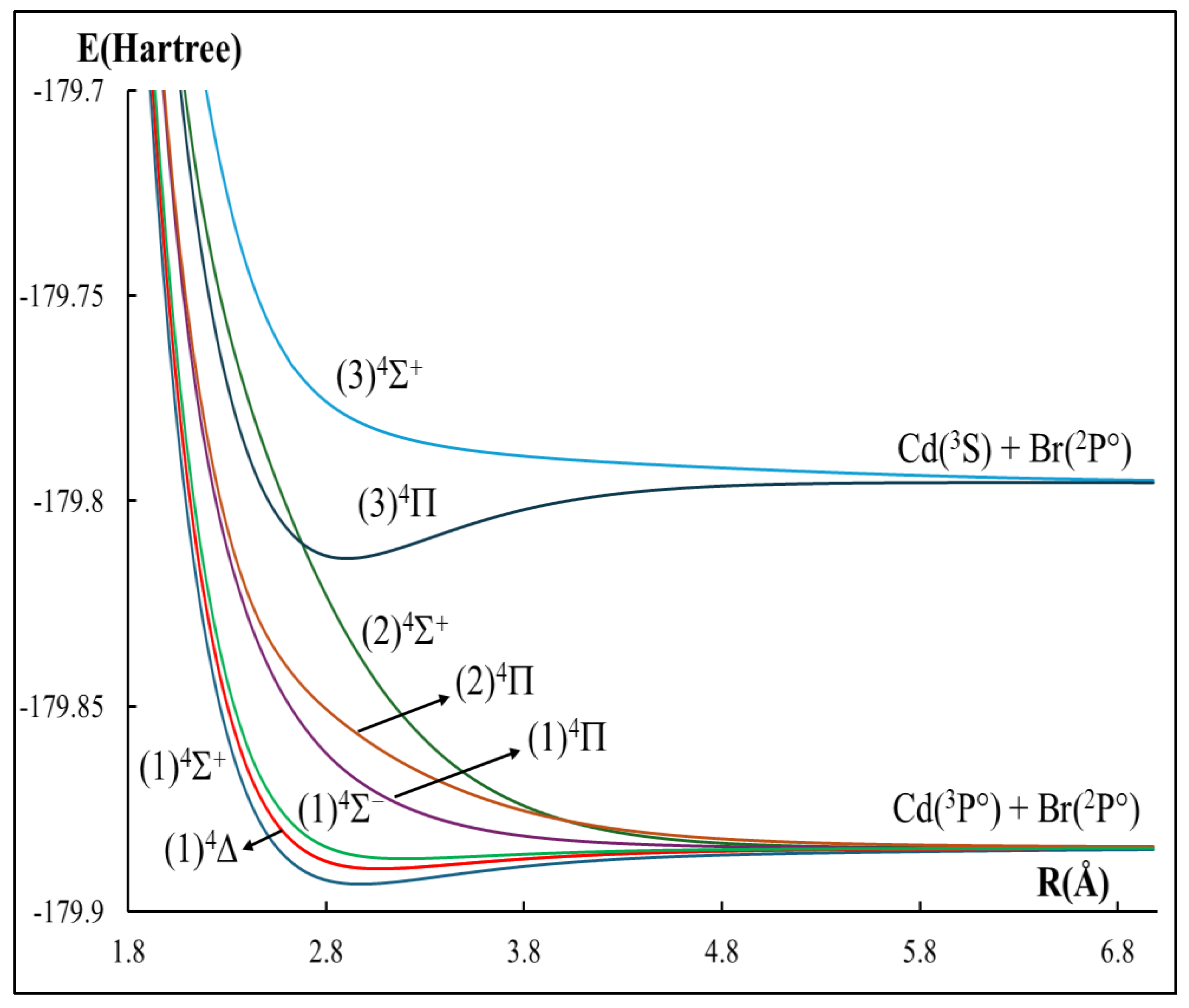 - Li, R.; Wang, M.; Zhao, S.; Zu, N.; Yan, B. Spin–orbit calculations on the ground and excited electronic states of CdBr molecule. J. Quant. Spectrosc. Radiat. Transf. 2018, 221, 110–117. [Google Scholar] [CrossRef]