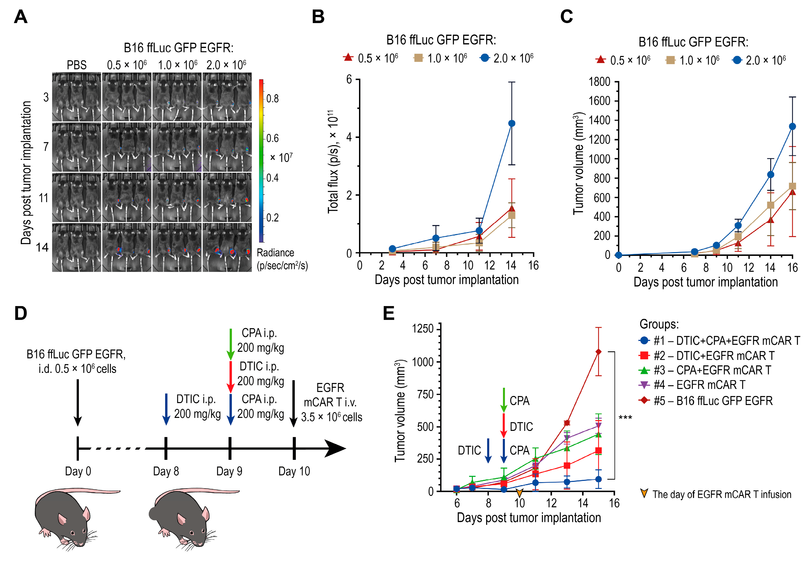 2.5. Combination of Dacarbazine and EGFR mCAR T Cell Therapy After Pre-Conditioning with Cyclophosphamide Leads to Robust Tumor Control and Extended Survival of Animals In Vivo