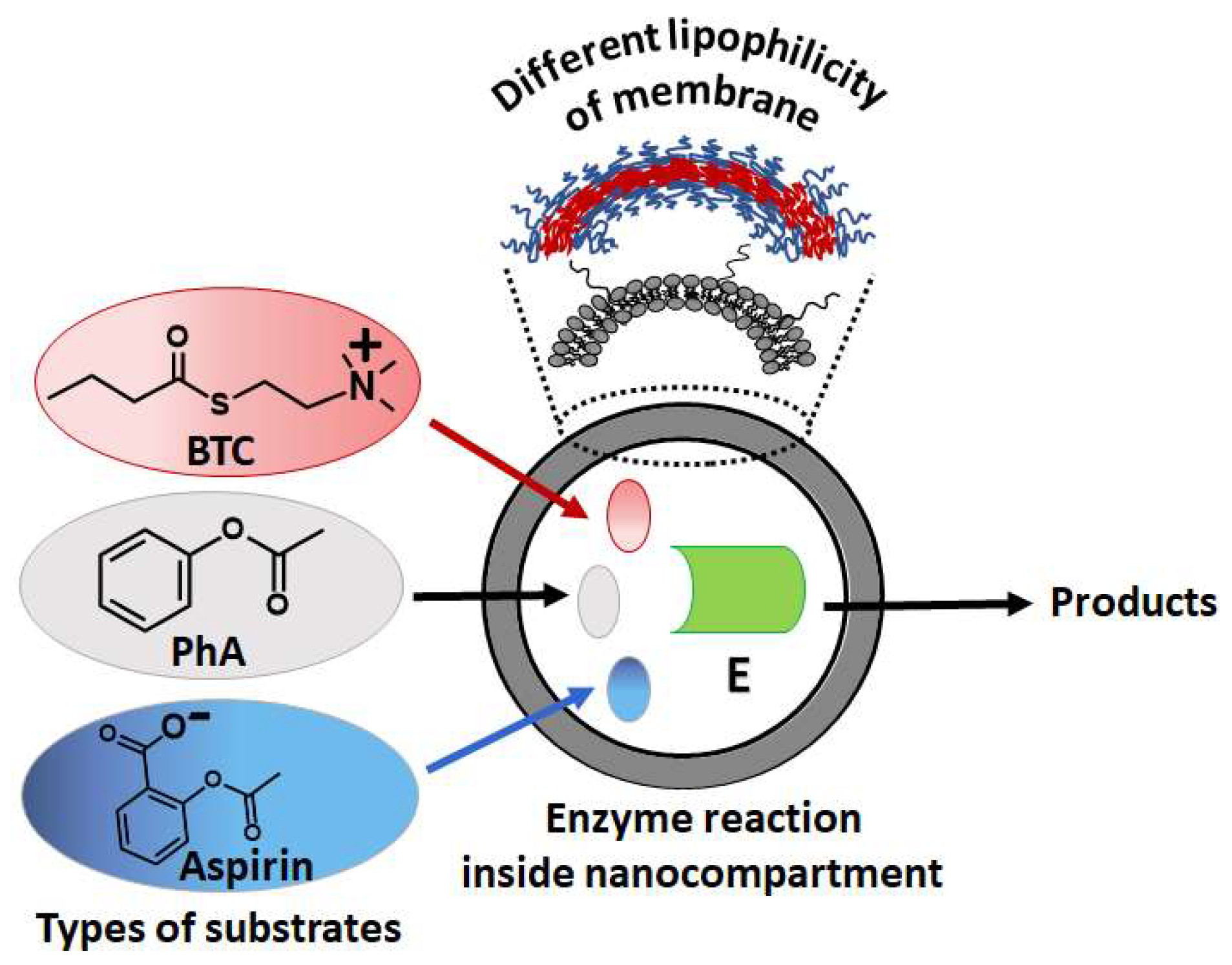 - Walde, P.; Marzetta, B. Bilayer permeability-based substrate selectivity of an enzyme in liposomes. Biotechnol. Bioeng. 1998, 57, 216–219. [Google Scholar] [CrossRef]