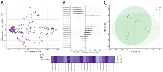 Figure 4. Immunophenotypic comparison between bone marrow and peripheral blood in patients older than 10 years: (A) Bland–Altman plot showing the difference between bone marrow and peripheral blood (BM − PB) expressed as standardized values (z-scores), including the mean bias (dashed line) and the 95% limits of agreement (dotted lines). (B) Forest plot of the bias (BM − PB) in percentage points for each immunophenotypic subpopulation, with 95% confidence intervals, ordered by magnitude. (C) Two-dimensional PCA illustrating the overall similarity between bone marrow and peripheral blood profiles, with 95% confidence ellipses for each tissue type. (D) Heatmap of Lin’s CCC for each immunophenotypic marker combination in this age subgroup.