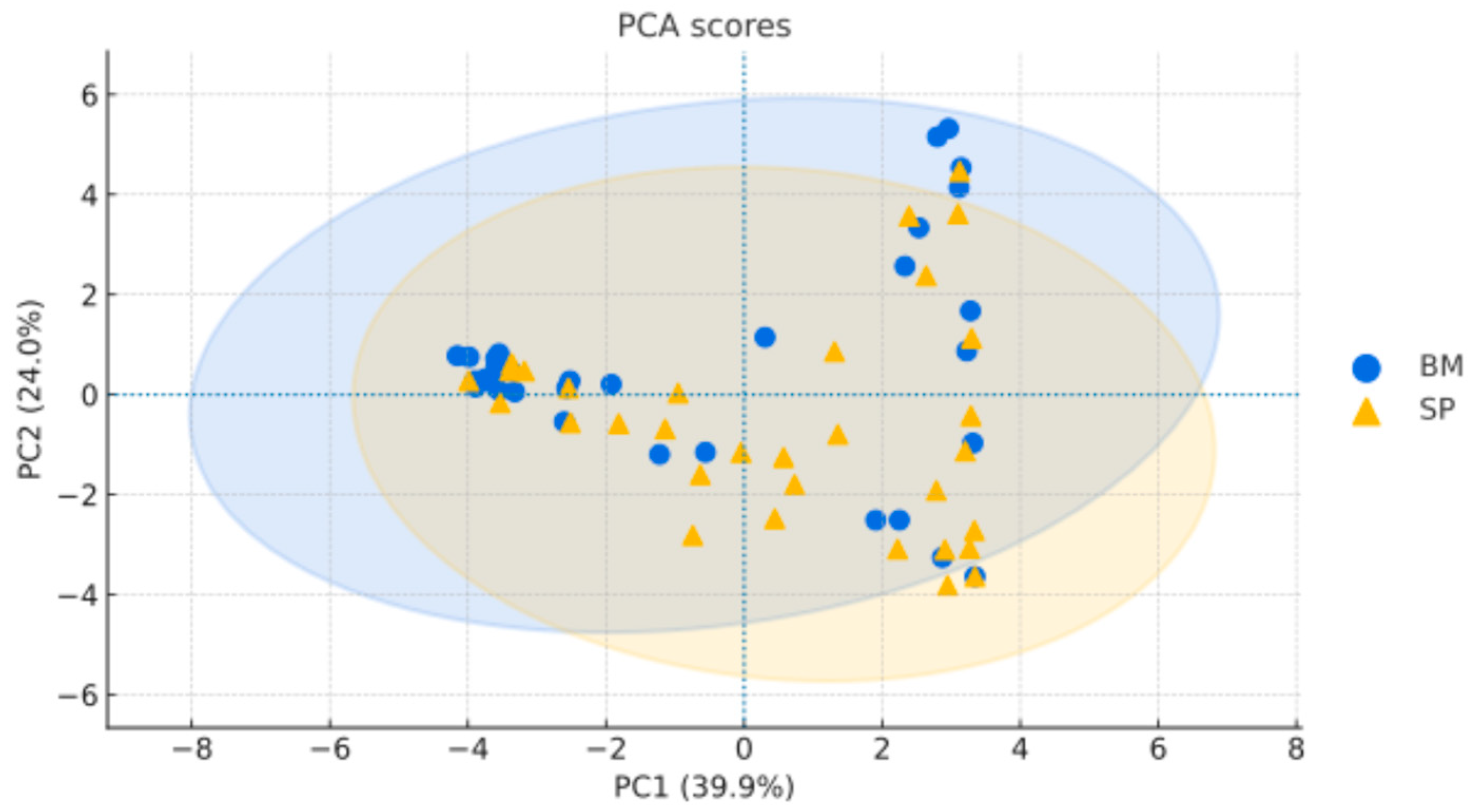 Figure 1. Principal component analysis of bone marrow and peripheral blood samples. Biplot showing the distribution of all paired samples projected onto the first two principal components derived from the proportions of B-cell subpopulations. The percentages on each axis indicate the variance explained by each component. Points represent individual paired samples from bone marrow and peripheral blood, and shaded ellipses delineate their approximate 95% confidence regions to visualize clustering and overall similarity between sources. Abbreviations: BM, bone marrow; SP, peripheral blood; PCA, principal component analysis.