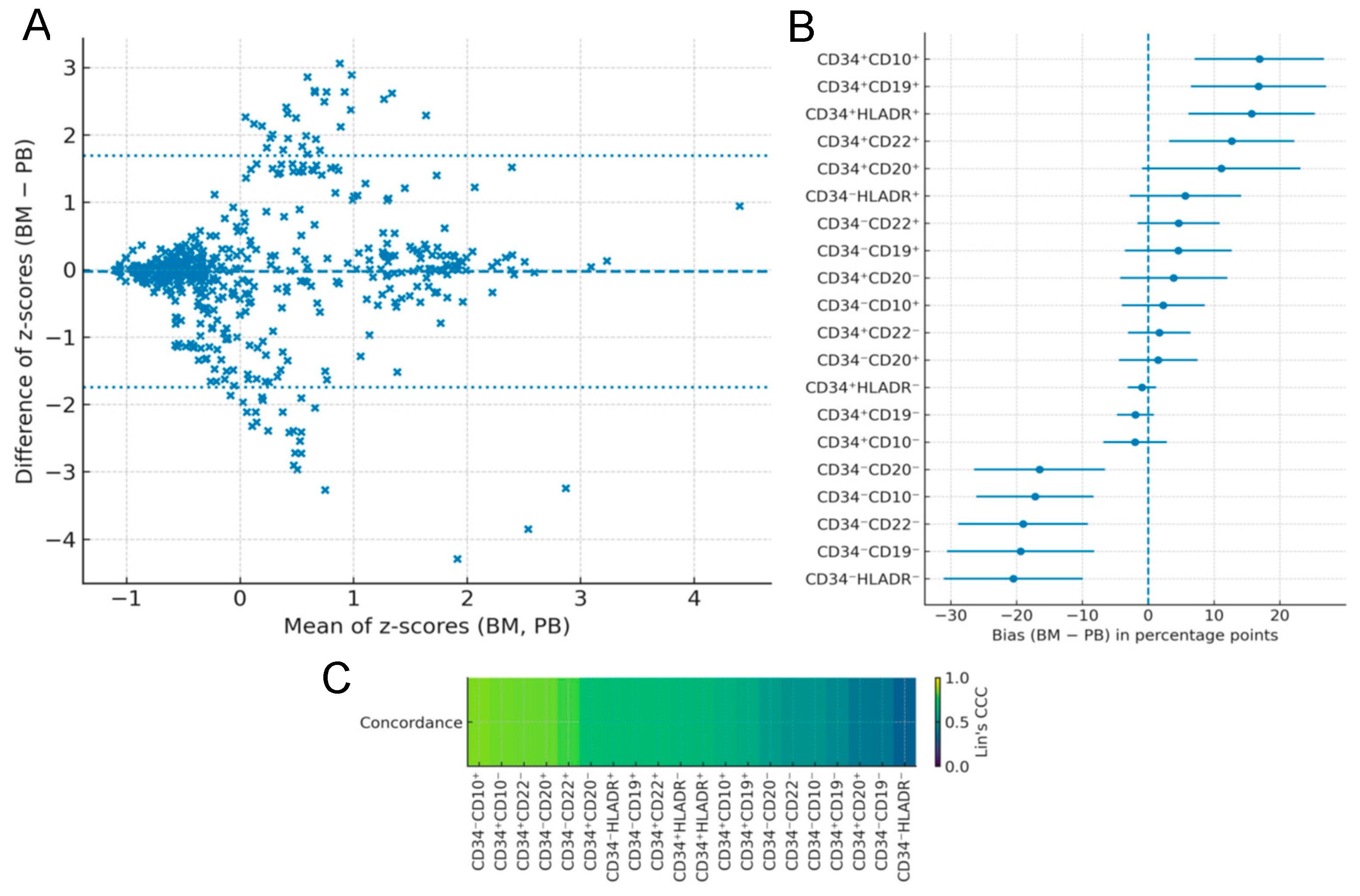 Figure 2. Concordance between bone marrow and peripheral blood immunophenotypic measurements in pediatric B-cell acute lymphoblastic leukemia: (A) Bland–Altman plot displaying the agreement between BM and PB across all evaluated CD34-positive subpopulations, plotted as the difference (BM–PB) versus the mean of standardized values (z-scores). The dashed line represents the mean bias, and dotted lines indicate the 95% limits of agreement. (B) Forest plot summarizing the bias (BM–PB) in percentage points for each CD34-positive marker combination, with corresponding 95% confidence intervals. (C) Heatmap of Lin’s concordance correlation coefficient (CCC), illustrating the overall strength of BM–PB agreement for each evaluated marker combination. Marker labels include superscript “+” or “−” to denote positivity or negativity for each antigen.