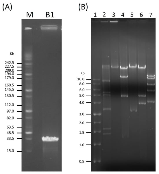 Genome size estimation and restriction analysis of phage B1. (A) Pulsed-field gel electrophoresis (PFGE) analysis showing the estimated genome size of phage B1 (~34 kb). Lane M: MidRange PFG Marker (New England BioLabs, Ipswich, MA, USA). (B) Restriction digestion profiles of B1 genomic DNA. Lane 1: TriDyeTM 1 kb DNA Ladder (New England BioLabs); lane 2: λ DNA–HindIII Digest (New England BioLabs); lane 3: undigested B1 DNA as a control; lanes 4–7: B1 genomic DNA digested with EcoRV, EcoRI, HindIII, and MluI, respectively.