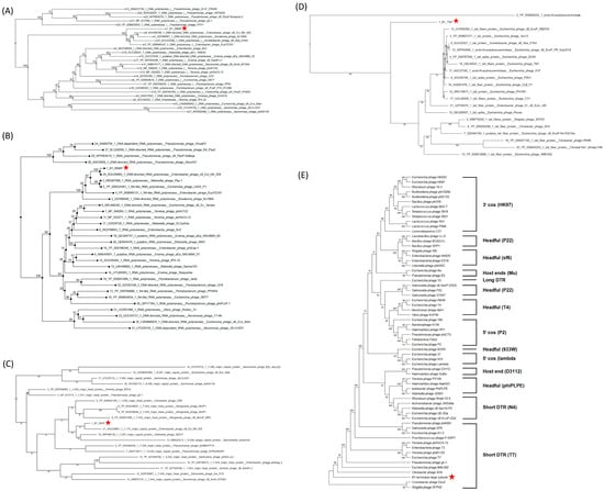 Phylogenetic analyses of key functional proteins of phage B1. Neighbor-joining phylogenetic trees were constructed for (A) DNA-directed DNA polymerase, (B) DNA-directed RNA polymerase, (C) major capsid protein, (D) tail spike protein, and (E) terminase large subunit, based on amino acid sequences. Red stars indicate the position of phage B1 in each tree. In panels (A–D), B1 clusters closely with Enterobacter and Citrobacter phages belonging to the Autographiviridae family, supporting its classification within this lineage. In panel (E), based on terminase large subunit phylogeny, B1 clusters within the short direct terminal repeat (DTR) clade characteristic of T7-like phages, consistent with its genome organization and predicted DNA packaging strategy. Numbers at the nodes indicate bootstrap support values. Brackets denote different DNA packaging strategies, with representative phages for each strategy indicated in parentheses. Bootstrap support values (>50%) are shown at key branching nodes.