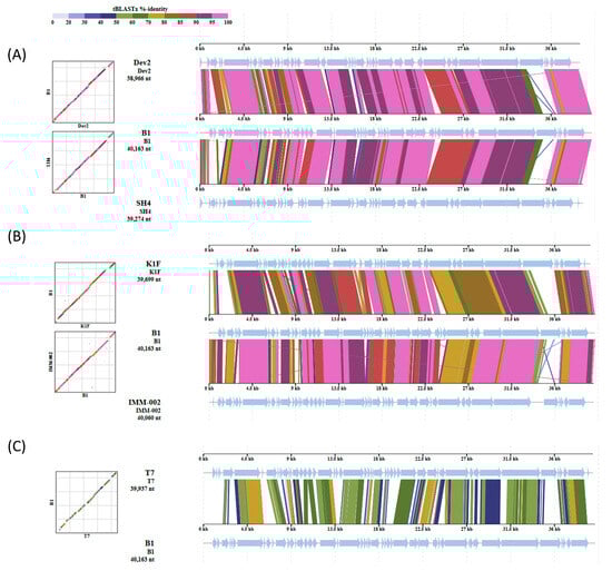 Comparative genomic analysis of phage B1 with related T7-like phages. Whole-genome tBLASTx version 2.17.0alignments show that B1 shares a conserved genomic backbone with phages Dev2 and SH4 (A); K1F and IMM-002 (B); and T7 (C). Arrows indicate predicted open reading frames (ORFs), and the arrow direction representing the direction of transcription. Core replication and structural gene regions display high synteny, while divergence is mainly observed in the tail spike pritein, consistent with variation in host recognition functions among Autographiviridae phages.