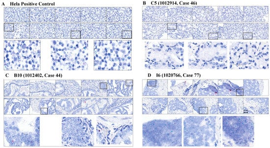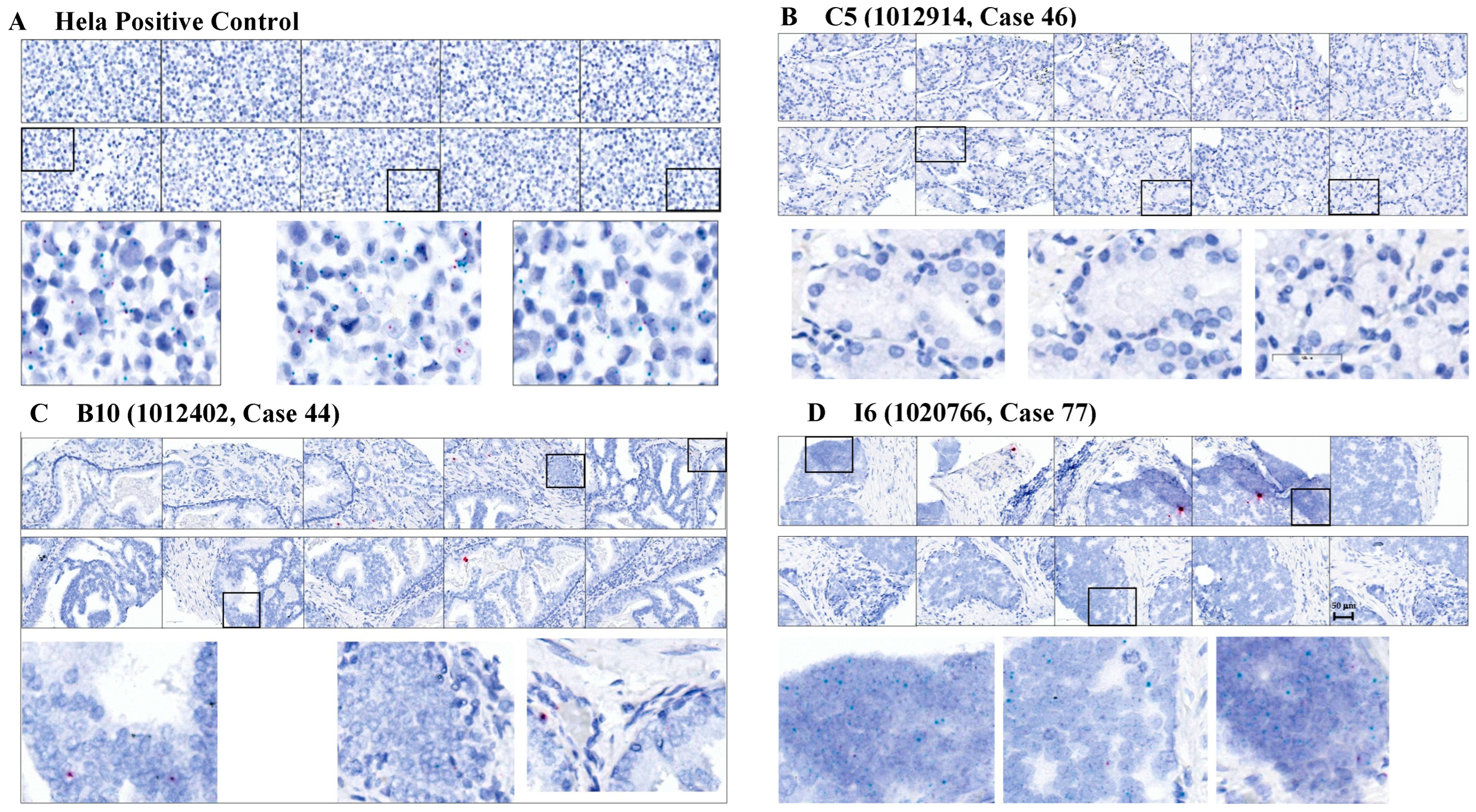 We analyzed the number of blue dots (HMGA2-WT) or red dots (HMGA2-TR) in tumor tissue by visual counting of the RISH images. Red dots represent truncated HMGA2 transcripts, which were detected using a probe conjugated to alkaline phosphatase (AP), and blue dots represent wild-type HMGA2 transcripts, detected using a probe conjugated to horseradish peroxidase (HRP). For each circular tissue sample, ten images were captured at 40× magnification (one at the center and nine around the periphery). The expression score for each image (ranging from 0 to 5) was determined by comparing the signal intensity to the HeLa control. HeLa cells were utilized as a positive control, assigning them a score of 5 for wild-type (more than 80 blue dots/field) and truncated (more than 40 red dots/field). Score 4 is 60–80 blue dots/30–40 red dots, score 3 is 40–60 blue dots/20–30 red dots, score 2 is 20–40 blue dots/10–20 red dots, score 1 is 0–20 blue dots/0–10 red dots and score 0 is neither blue nor red dot was observed in the field.