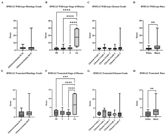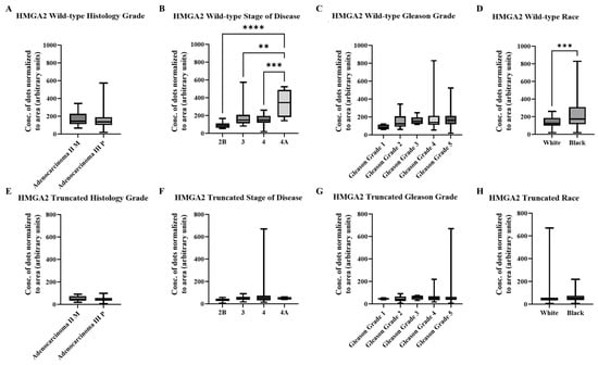 We next quantified our RISH images using the newly developed AI/ML model. Table 2 summarizes the wild-type and truncated HMGA2 mRNA signals detected by the AI model in the Fox Chase tissue microarray. The higher signal of wild-type HMGA2 compared to truncated HMGA2 was consistent with the manual scoring system. Histological grade again showed no statistically significant differences for wild-type or truncated HMGA2 (Figure 4A,E). However, wild-type HMGA2, but not truncated HMGA2, showed significantly increased expression with advancing stage (Figure 4B,F), while no statistical differences were observed by Gleason grade (Figure 4C,G). Additionally, Black patients exhibited higher levels of wild-type HMGA2 compared to White patients, whereas no significant difference was observed in the expression of truncated HMGA2 (Figure 4D,H).